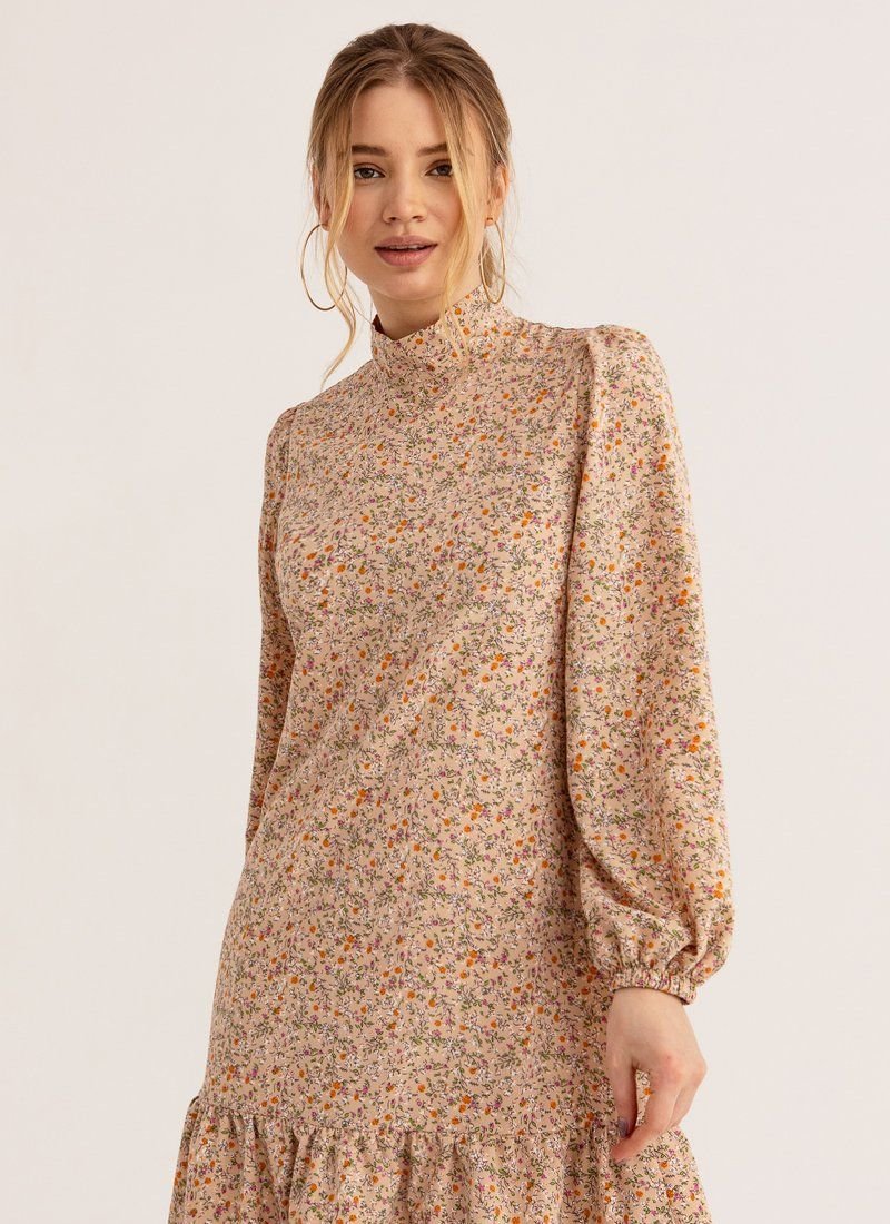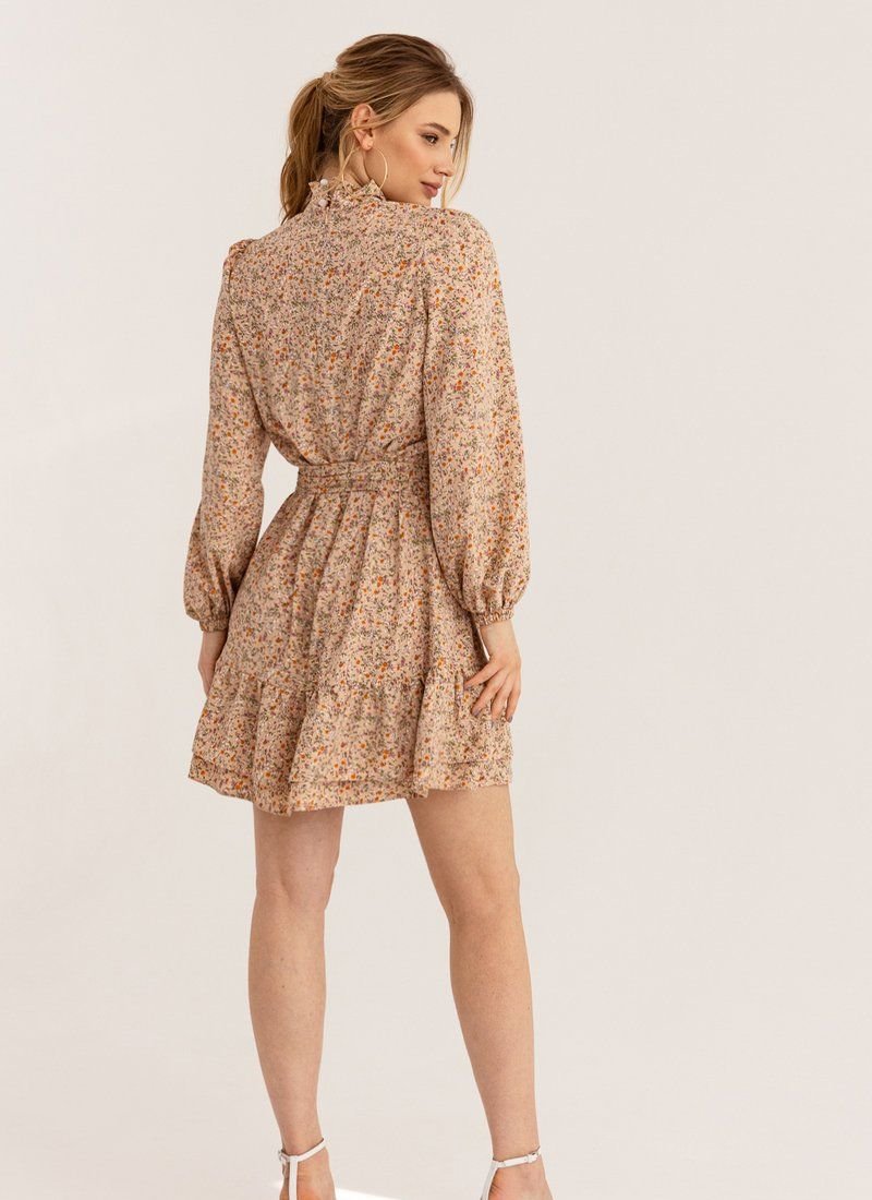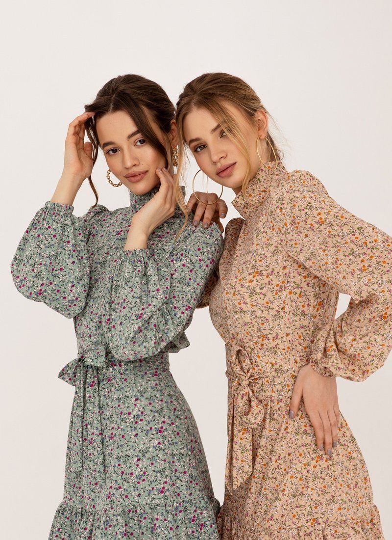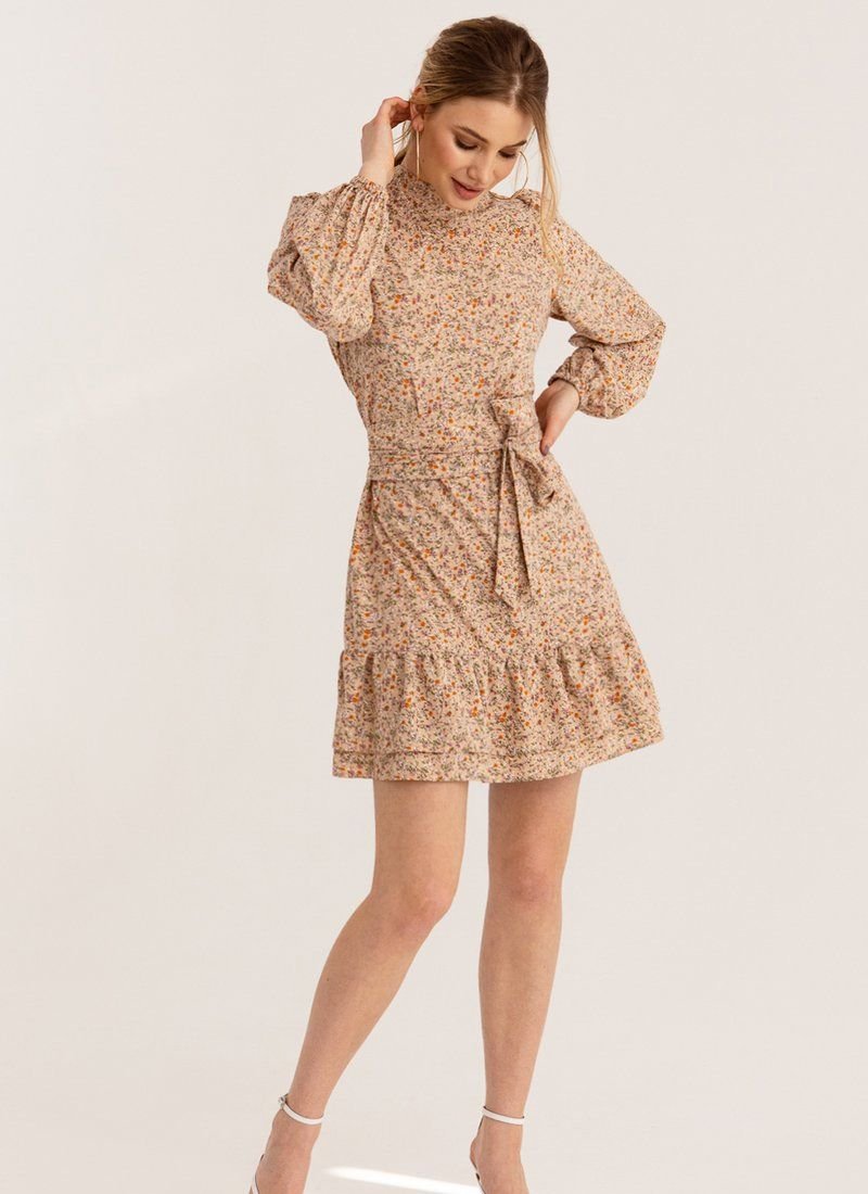A mini dress in a beige shade is made of a light fabric, which is best suited for warm weather. The model is complemented by a two-layer flounce at the hem, a stand-up collar and voluminous sleeves in the spirit of the SS’21 Balmain and Balenciaga shows. The belt allows you to make the silhouette fitted.