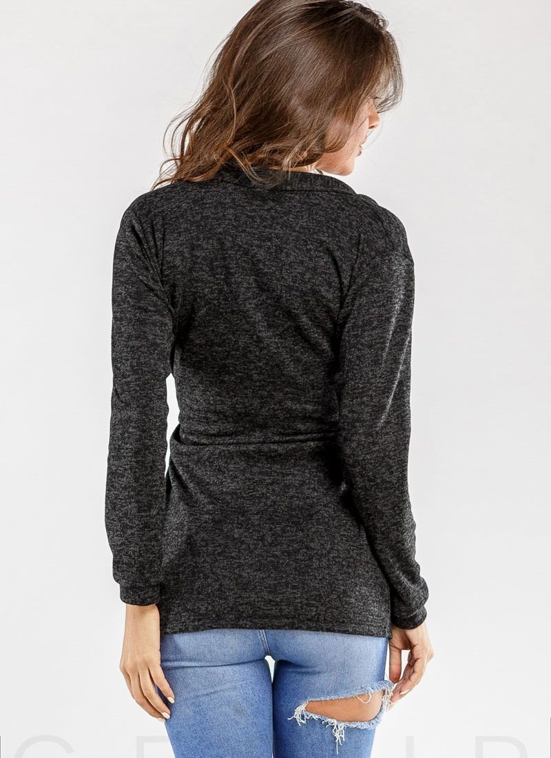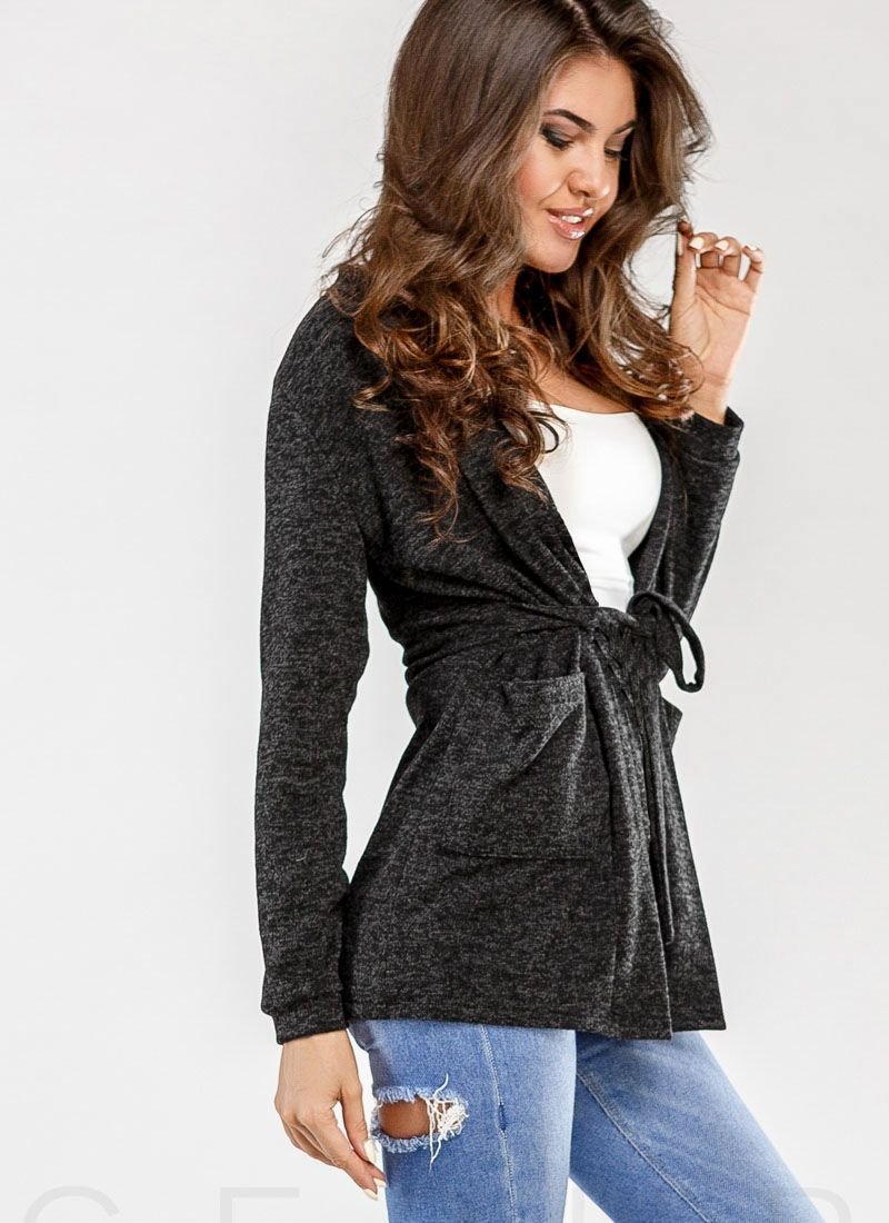 A short knitted cardigan with two patch pockets and a sewn belt.