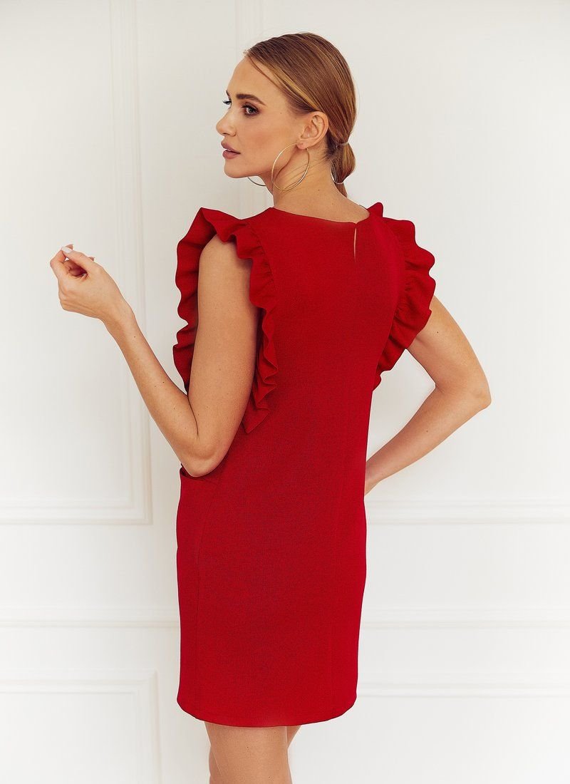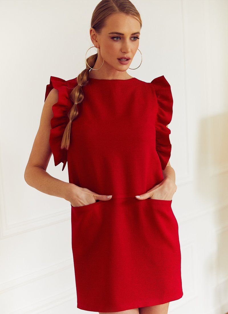 The straight-cut red dress turned out to be girlish romantic. To sew a model with ruffled sleeves and sew-in pockets on the waistline, artificial linen was used, which is characterized by a non-uniform texture.