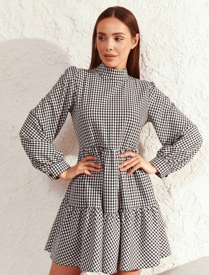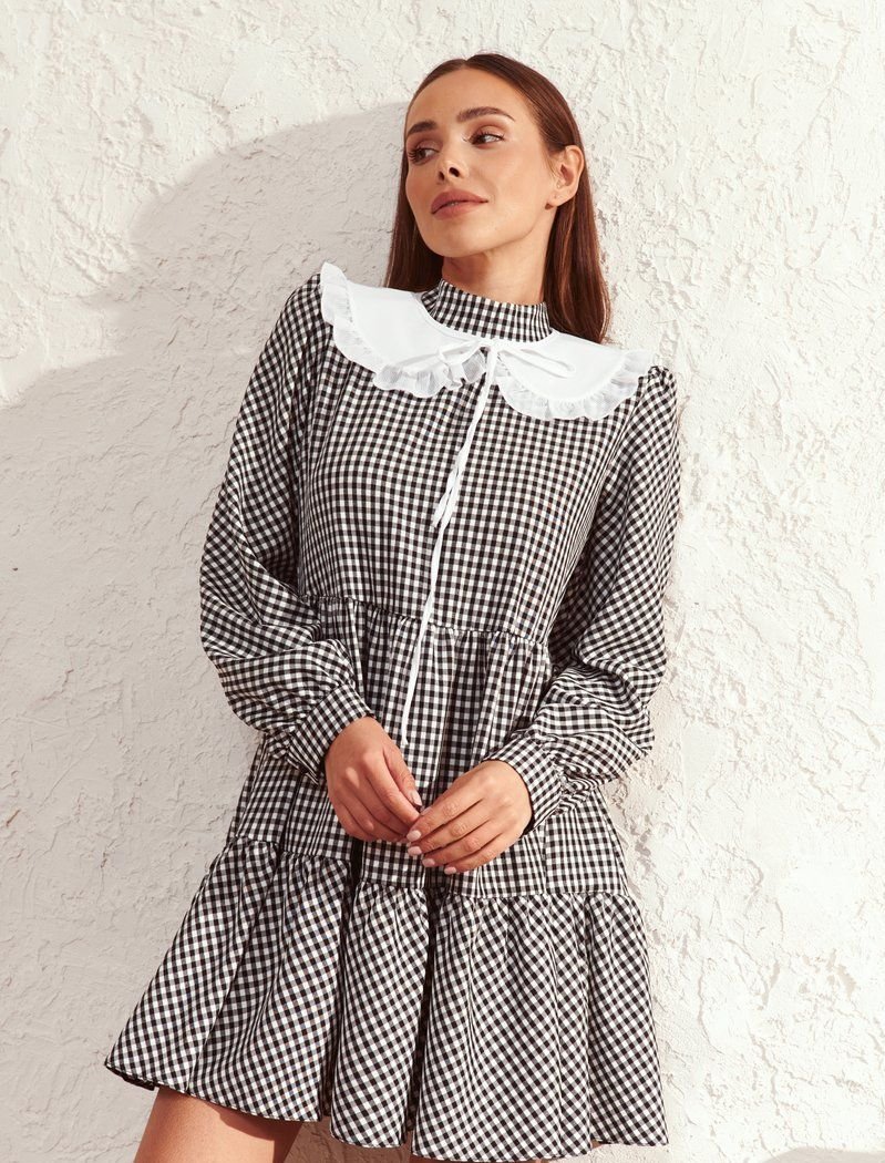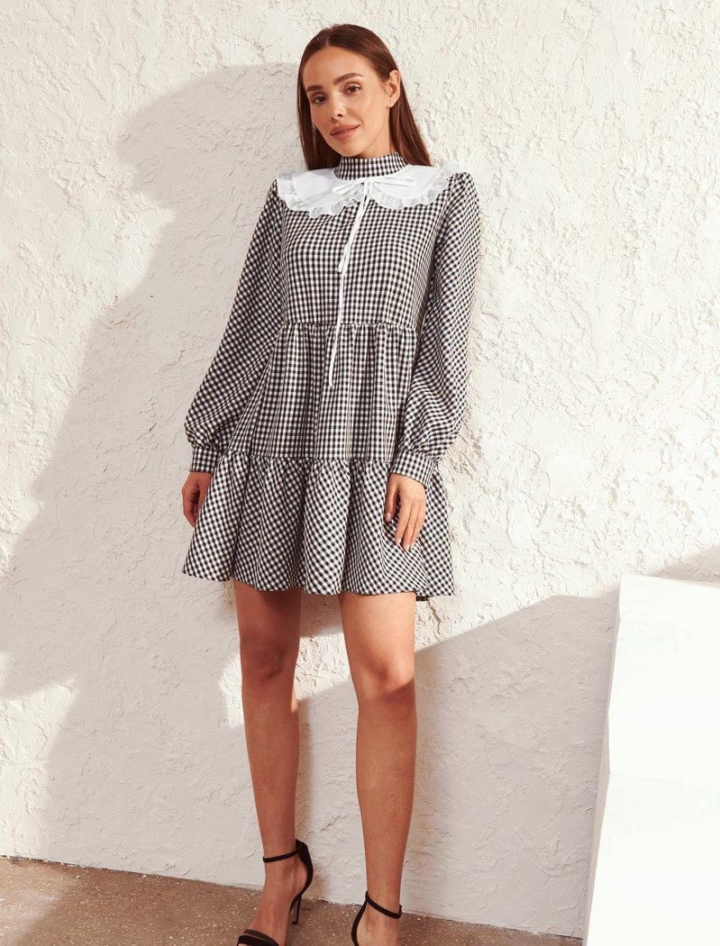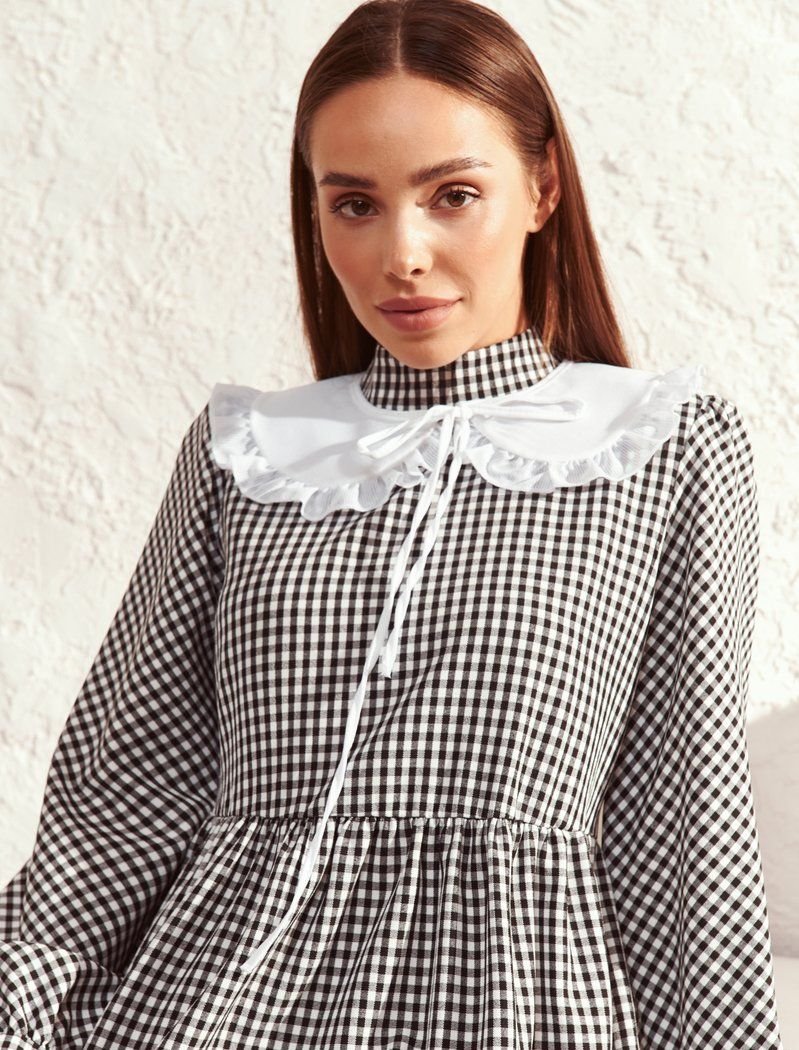 A loose dress in a small black and white check was decorated with one of the romantic trends of SS ' 21 according to Vogue: an accent collar with ruffles. Similar details could be seen at the seasonal shows at Alessandra Rich.