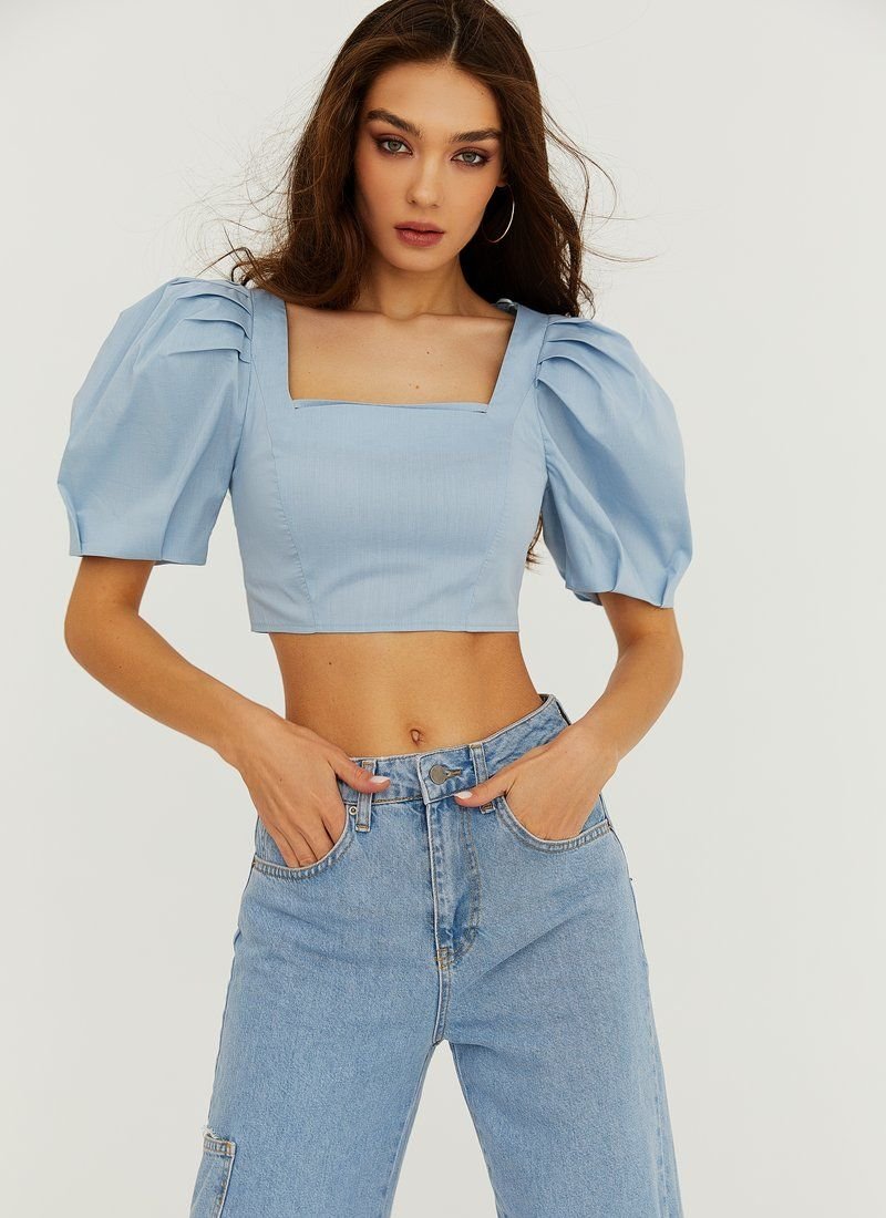 Voluminous shoulders and sleeves are still relevant in the 2021 season: they can be seen in the Alberta Ferretti collection. A blue crop top with airy sleeves will give a romantic subtext to the image. The decollete area was emphasized with a square neckline.