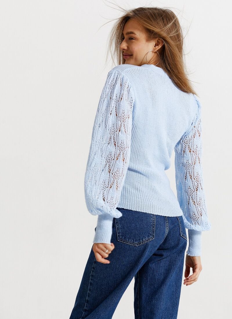 A cozy pullover of a delicate blue color. V-neck, long openwork sleeve on a wide elastic cuff. Fixed smell .