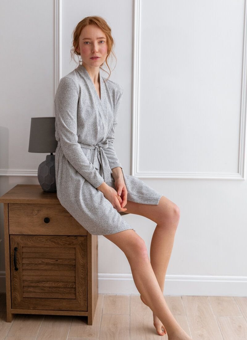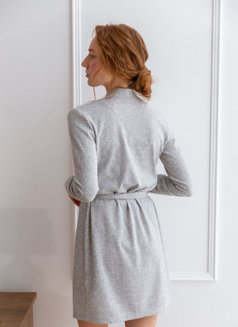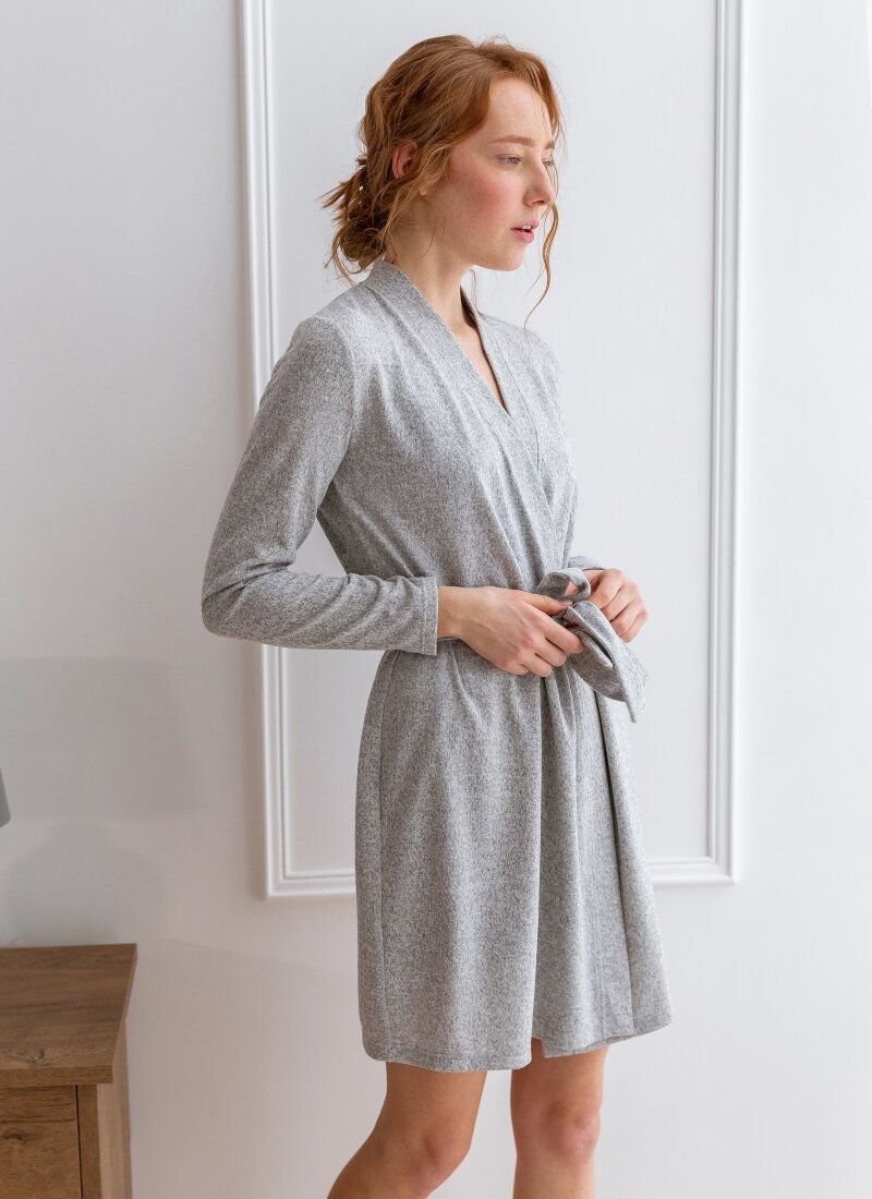 The gray robe was made as comfortable as possible. The model was sewn from a melange knitted material. Thanks to the soft texture, the fabric feels nice on the body. The belt-belt will allow you to adjust the fit.
