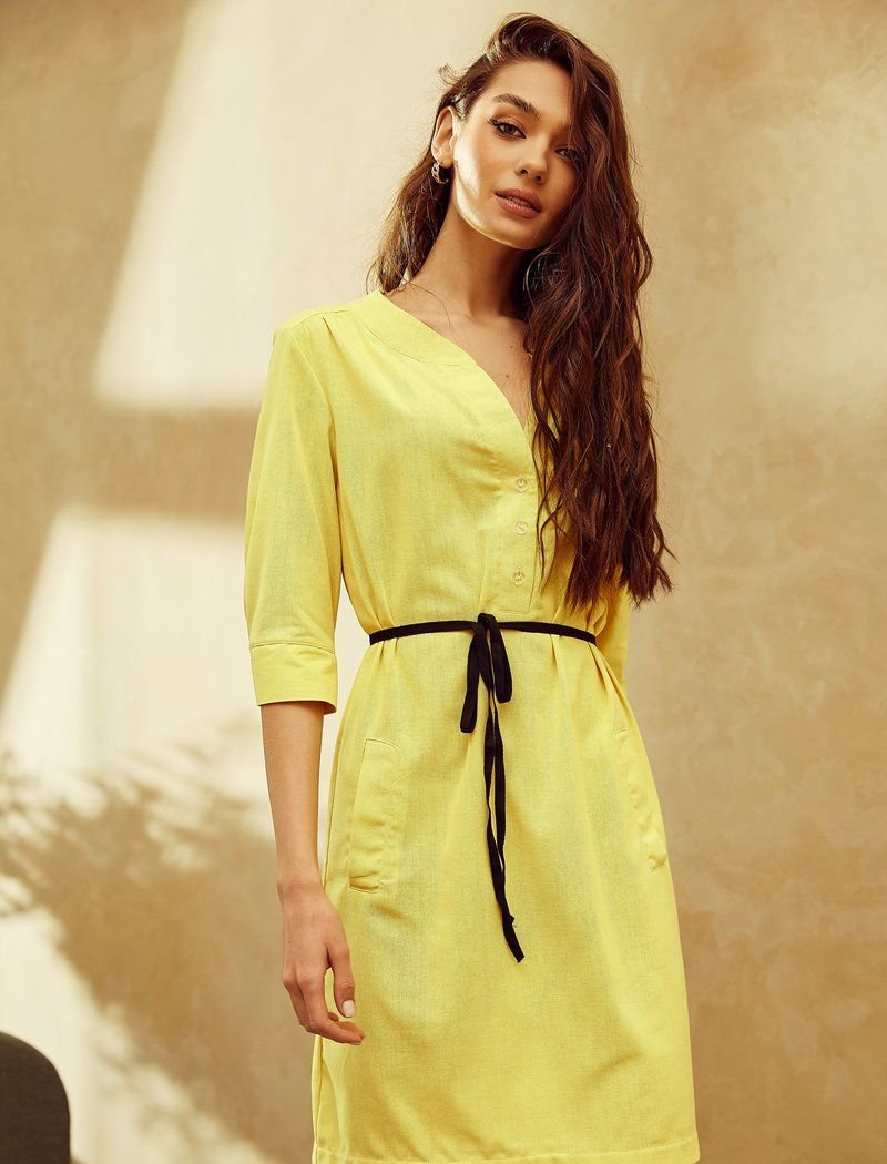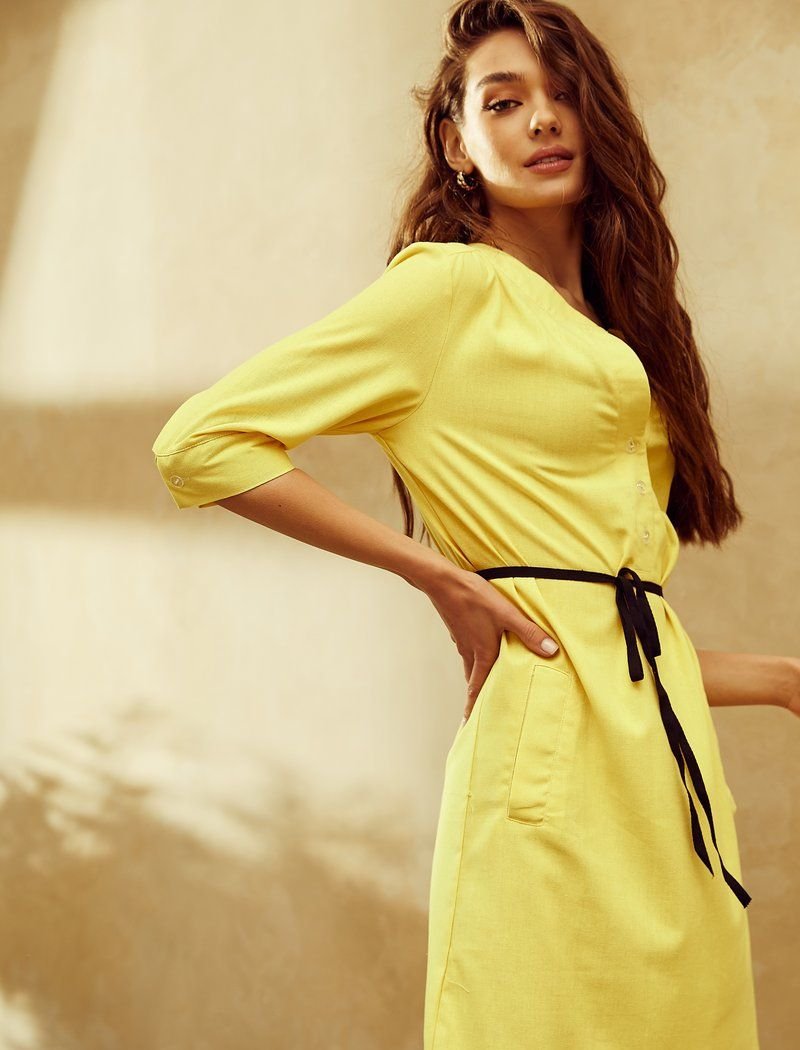 A loose tunic dress made of rich yellow linen. The model has a straight cut with a neat cutout on the chest, which can be easily adjusted with a button closure. a short sleeve with a wide cuff, two decorative pockets on the skirt and a long lace belt of contrasting black color that emphasizes the waistline.