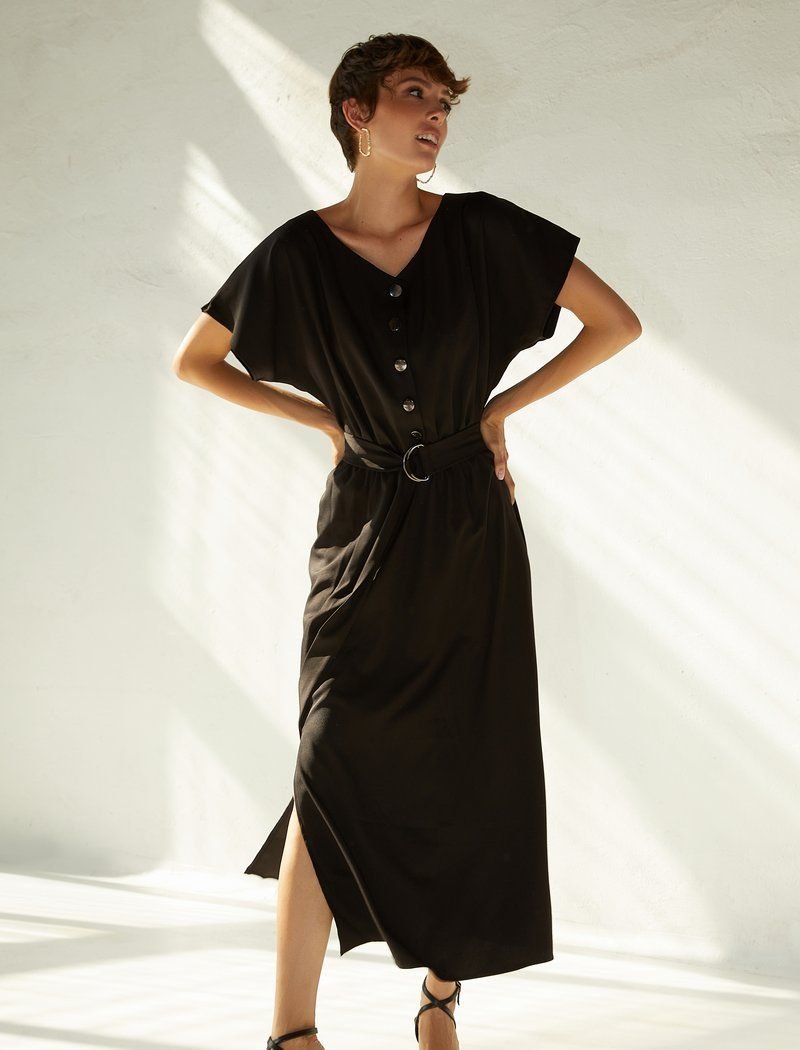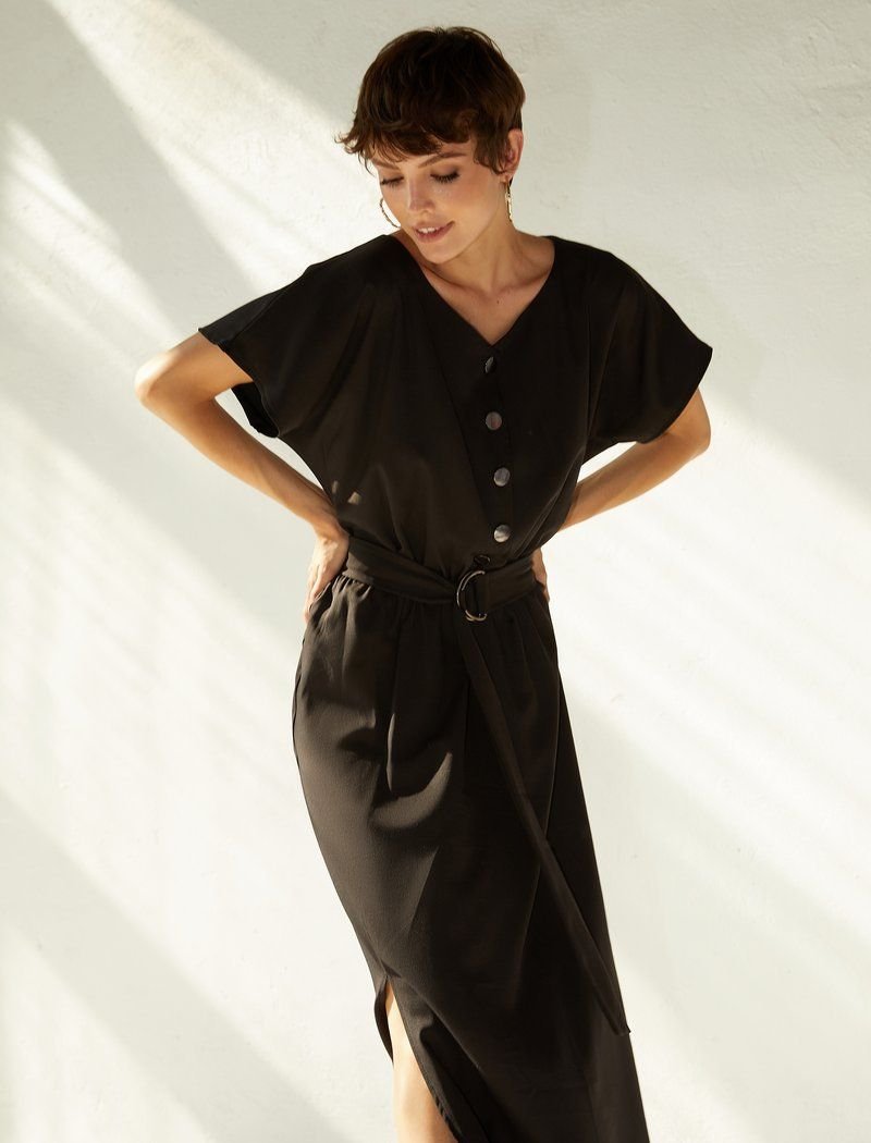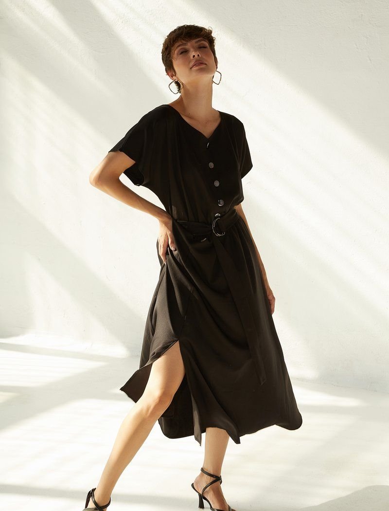 Black cotton long dress with short sleeves. The upper part of the dress is buttoned, there is a built-in elastic insert at the waist, you can also make an additional emphasis on the waist by adding a wide belt to the image. The skirt has a flared cut, with a small slit on one side. It is easily combined with both white sneakers and classic pumps.