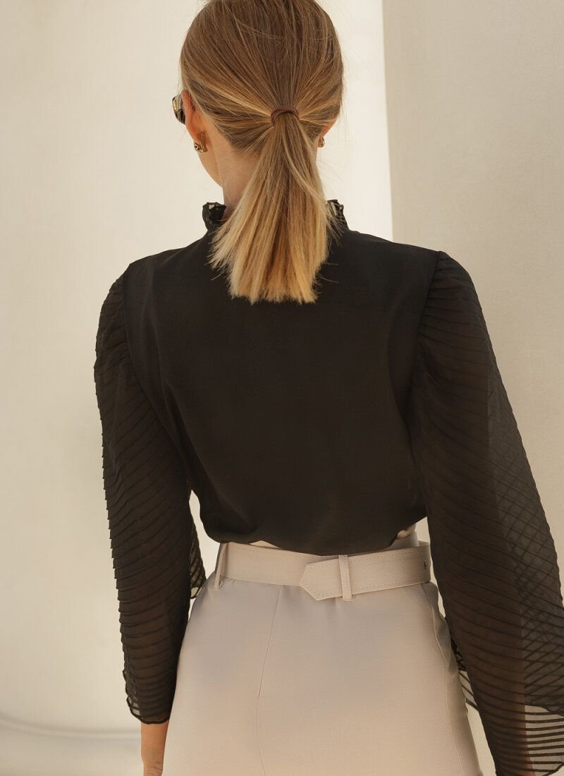 A feminine blouse of basic black color. Two fabric textures are combined in the model. The wide long sleeves are made of pleated chiffon. V-neck, stand-up collar with ties add romance to the image.