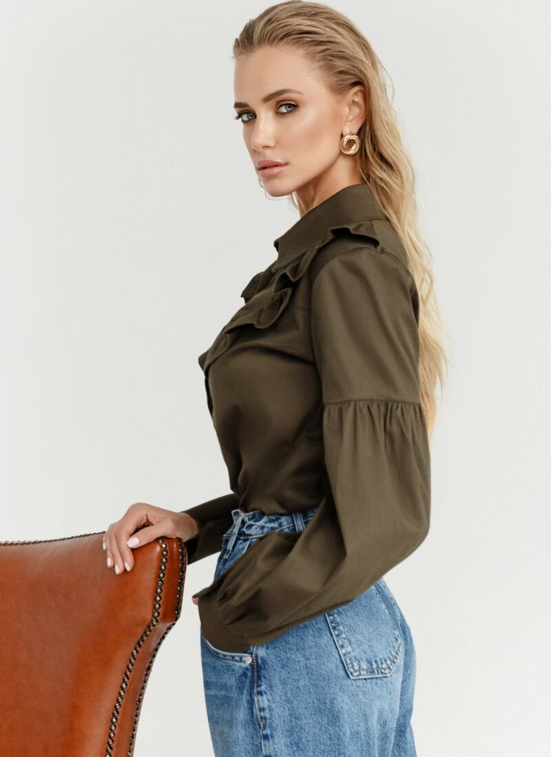 Stylish women's khaki shirt made of thick cotton fabric. A classic stand-up collar, a puffy sleeve with a button cuff and a yoke decorated with ruffles.