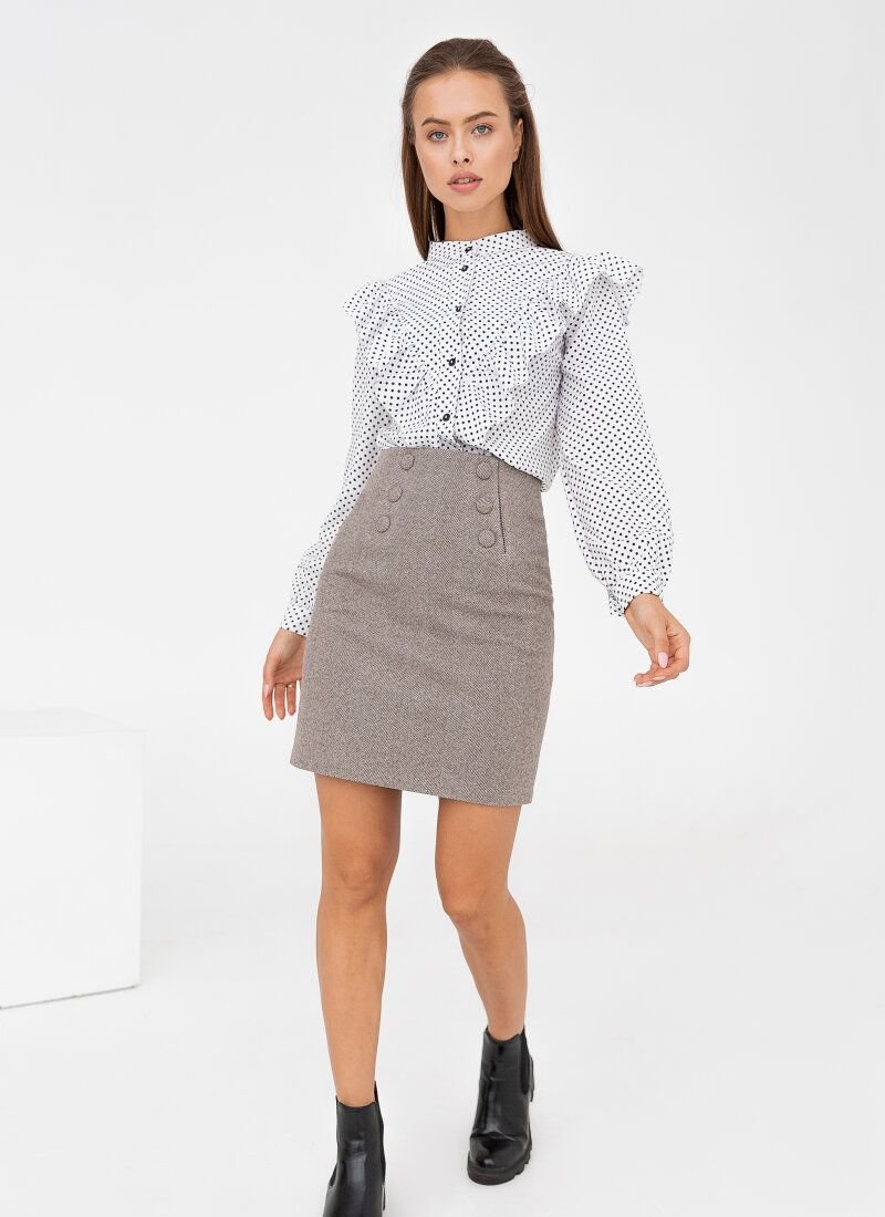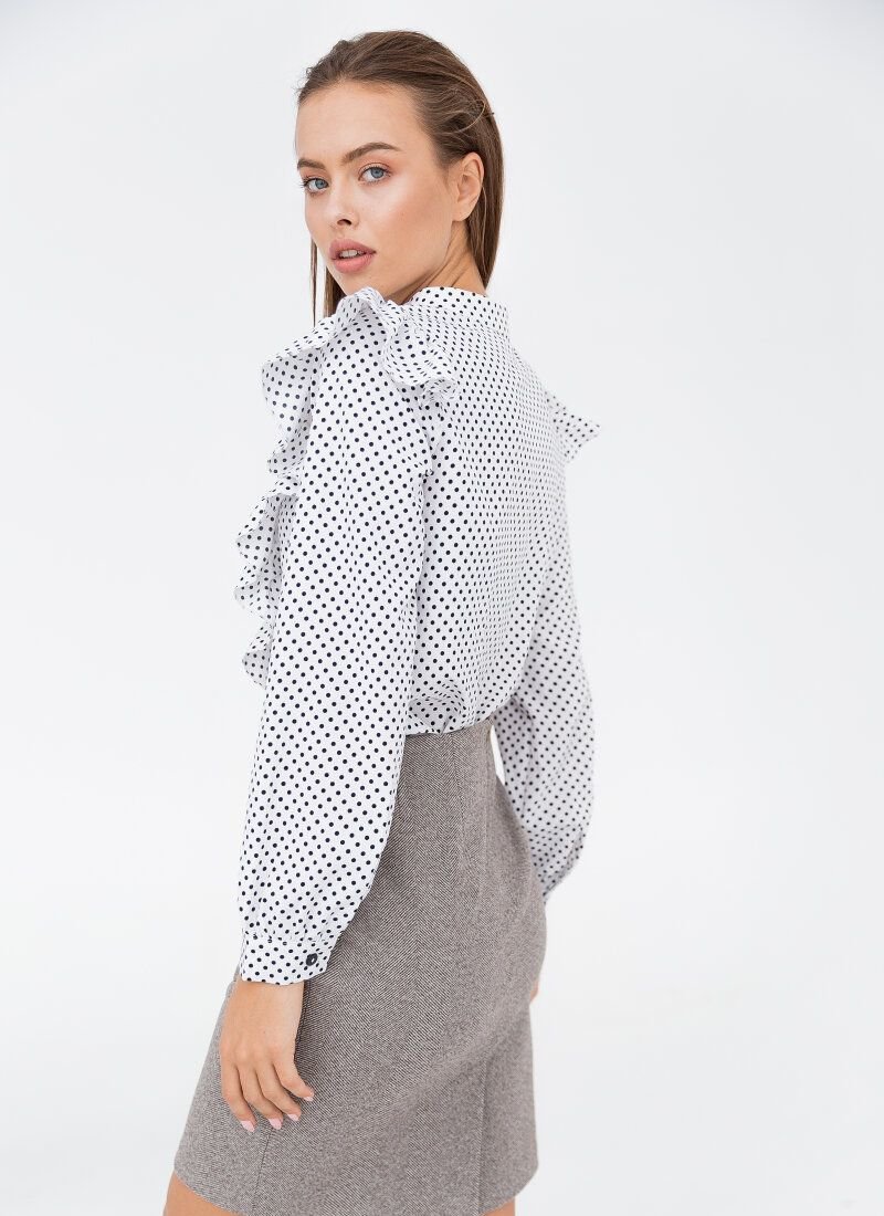 The white blouse supports the romantic trends of 2020 - pea print and flounces. The model was complemented with wide sleeves at the cuffs and a stand-up collar.