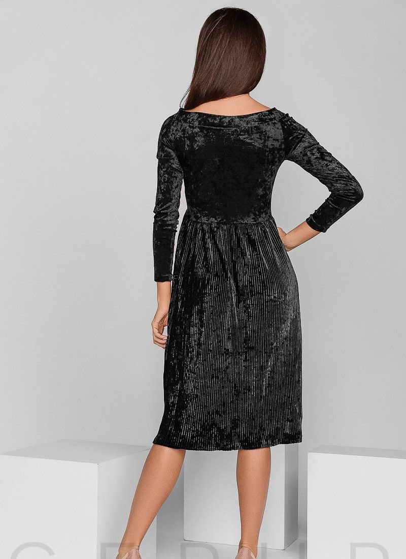 Elegant women's dress with a boat neck, long sleeves, an inflated waistline and a flowing ruffled skirt.