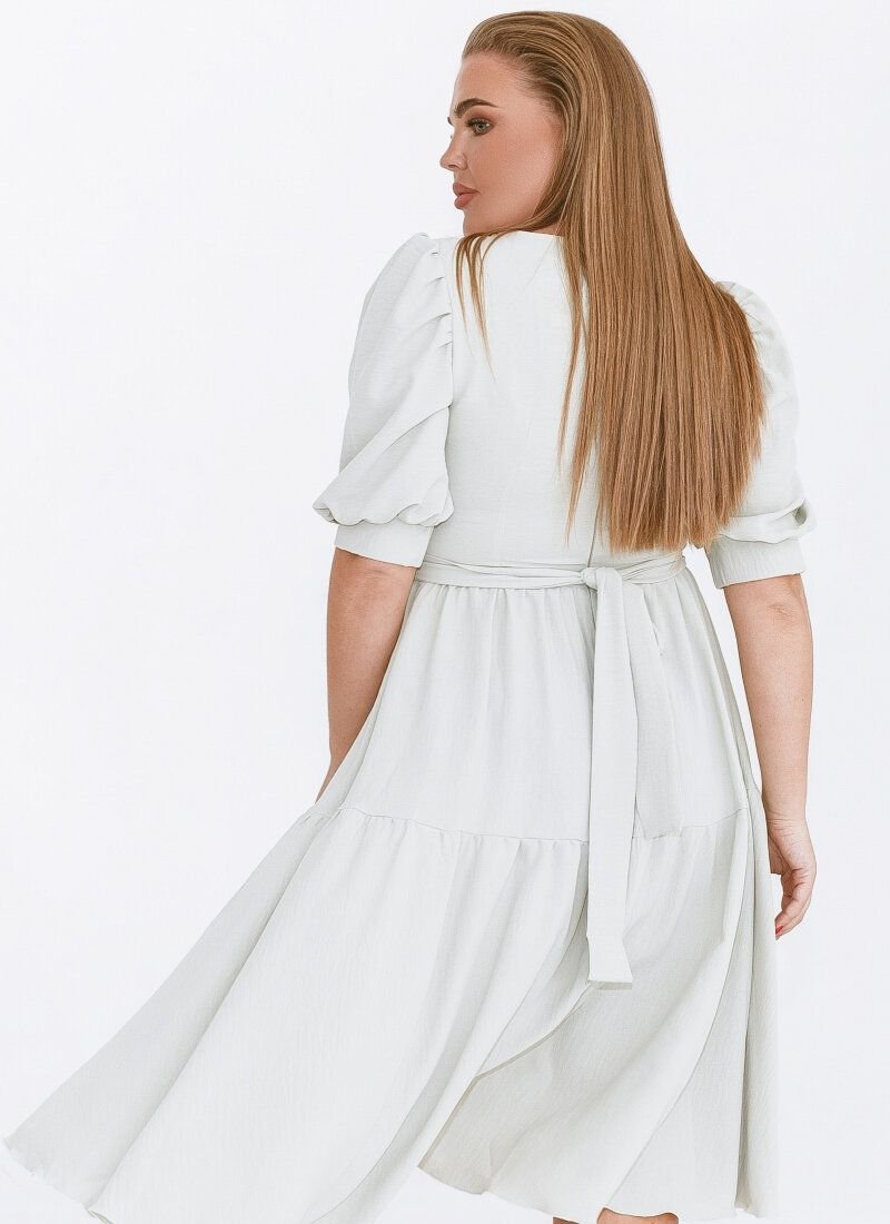 Mint dress with trendy voluminous sleeves is complemented by a loose multi-tiered skirt. A removable fabric belt will allow you to put an emphasis on the waistline.