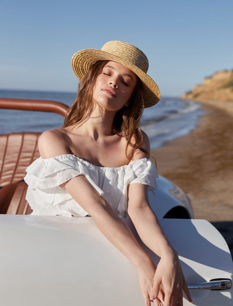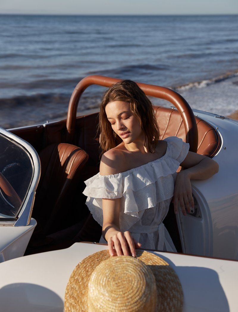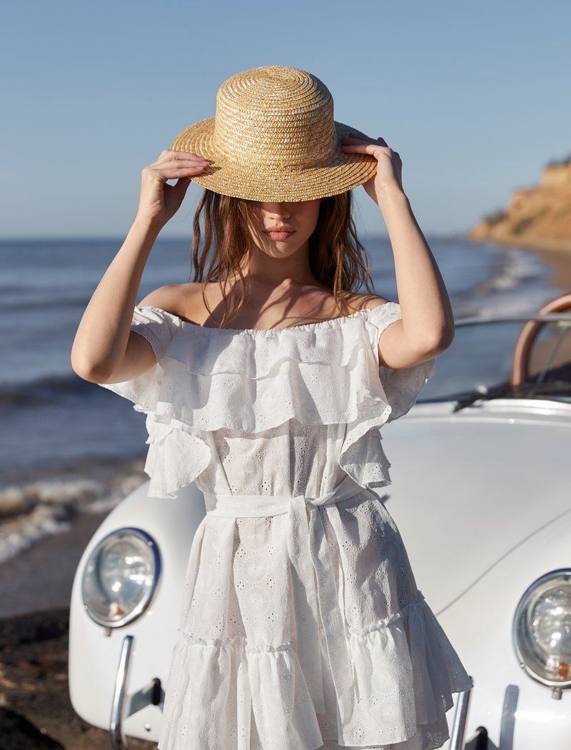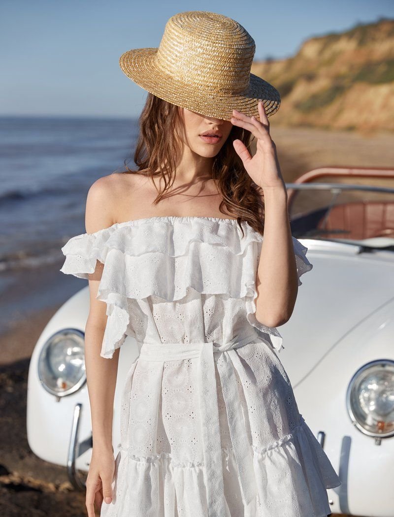 A short white dress will inevitably attract attention. The material with openwork embroidery, wide ruffles on the hem and the neckline area work for this. A belt-ribbon allows you to make the silhouette fitted.