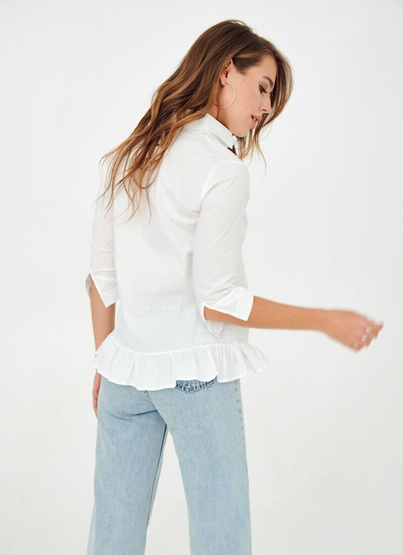 A white shirt will dilute the classic office dress code and allow you to get rid of excessive rigor in the image. A dense cotton-based material was chosen for sewing the model. The lower edge of the product was supplemented with a frill.