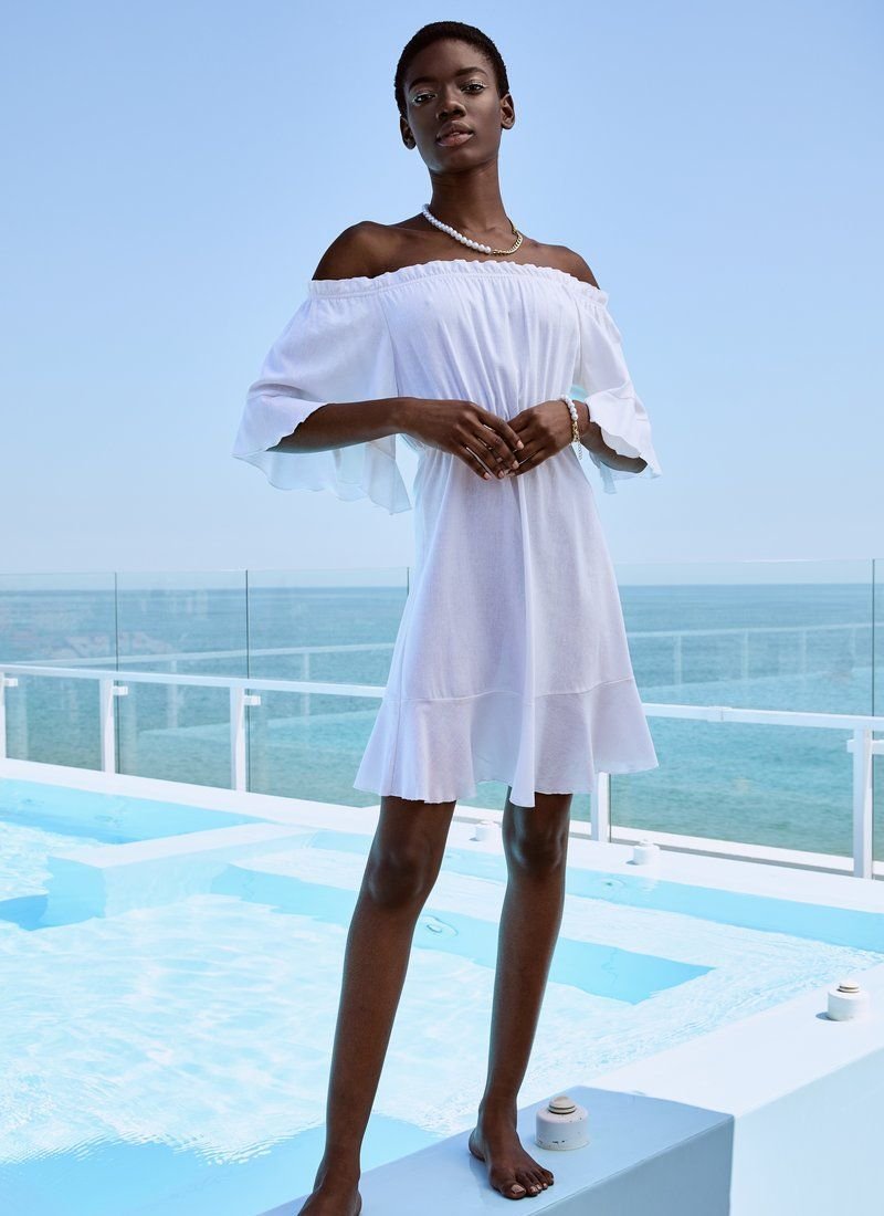 The romantic mood of the white dress is formed by a fitted cut with an open shoulder line. Wide sleeves and a hem with flounces support the image. The belt allows you to emphasize the waistline.