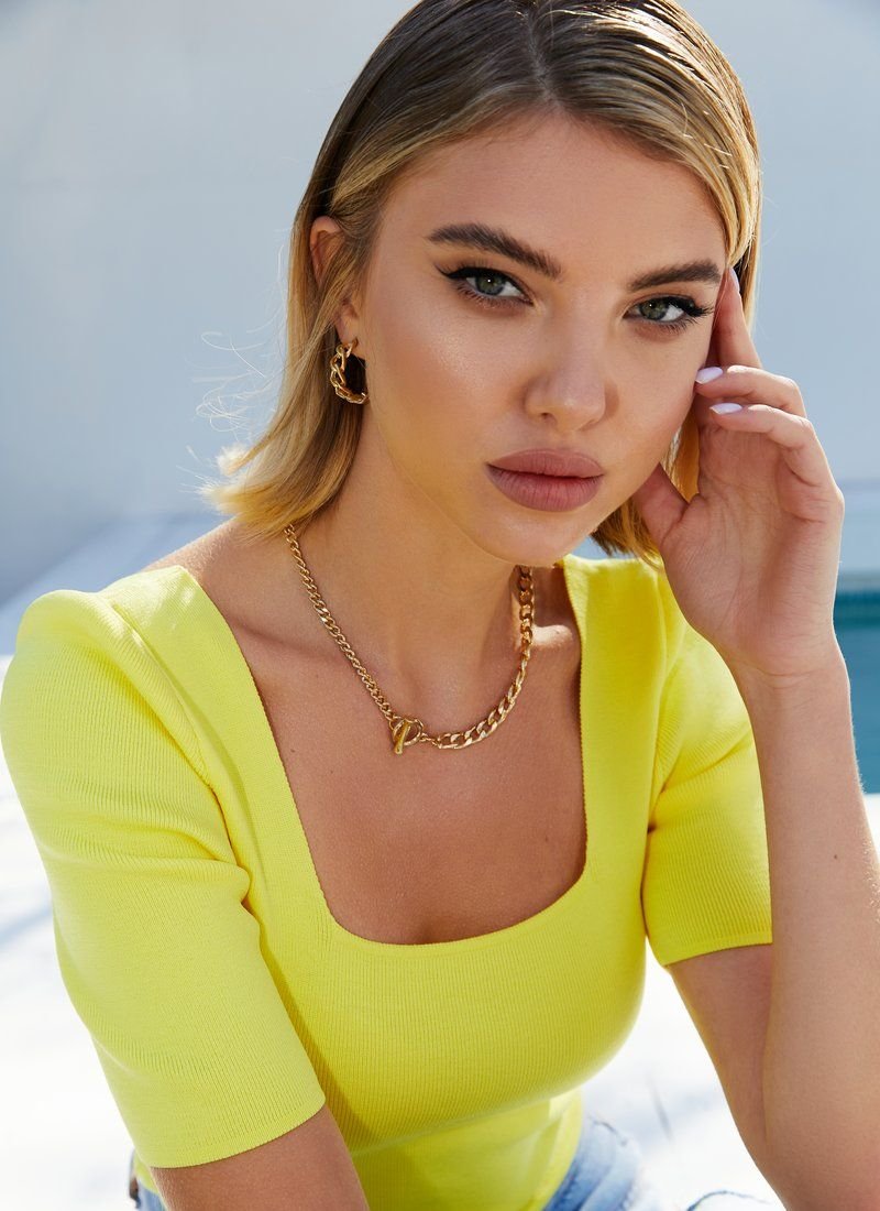 The yellow tight-fitting T-shirt was sewn from soft knitwear, which does not leave the list of trends in SS'21. A one-color thing will easily play into both an everyday and a more complex image.
