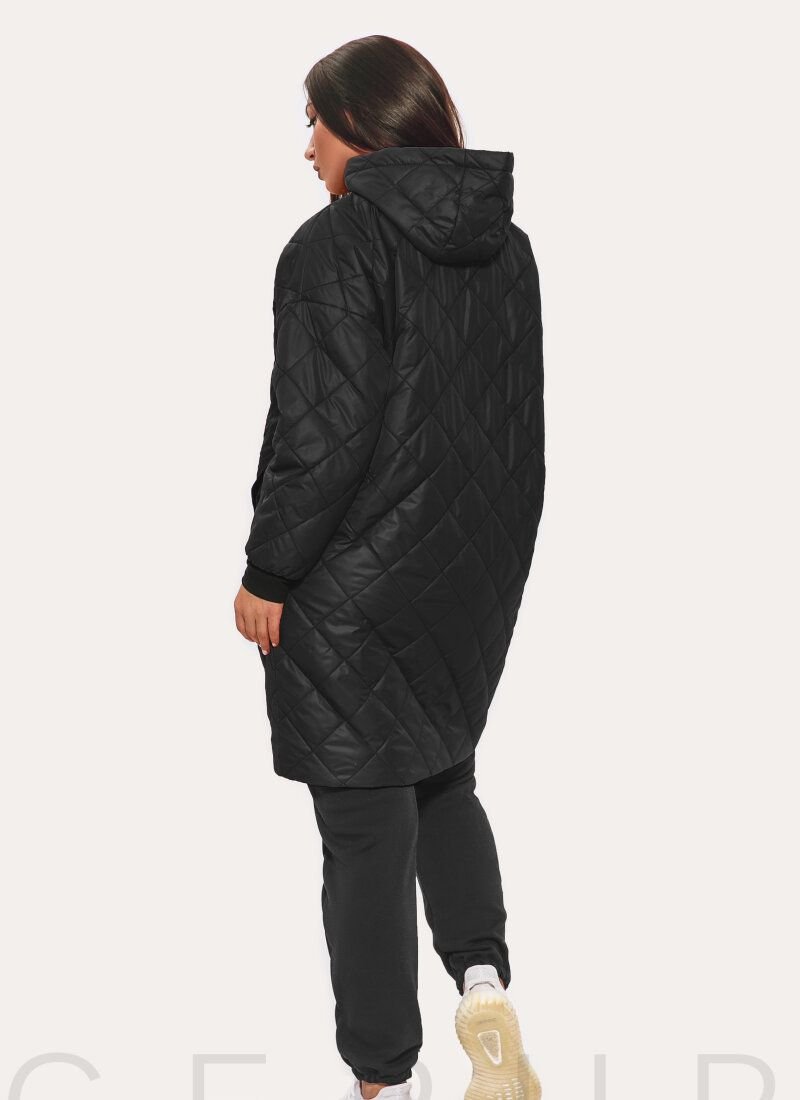 Elongated black jacket-oversize: non-detachable hood, stand-up collar, voluminous sleeve with contrasting elastic cuff, two welt pockets.Features: additional insulation - sintepon (100 g /m2). Please note that the product is designed for temperatures up to +5 °C.