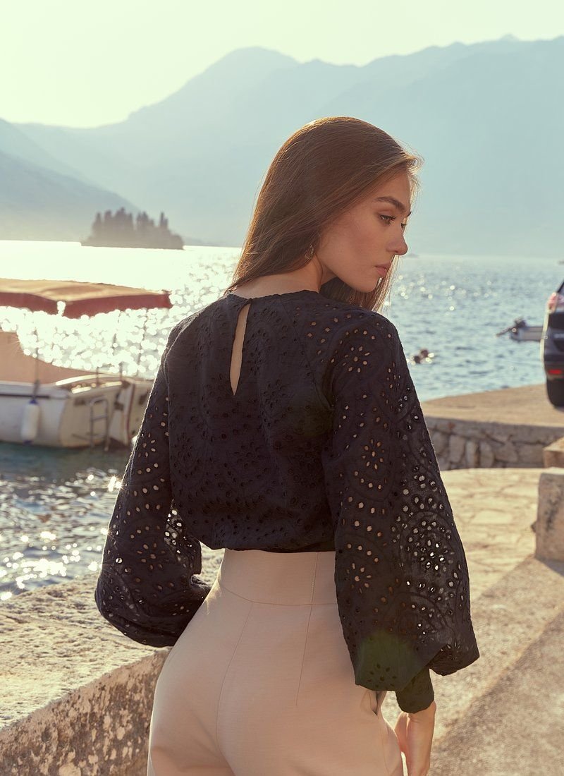 A black blouse made of light stitching can become the basis of a romantic image in the boho style. The model is complemented by an up–to-date SS'21 detail - voluminous sleeves. A loose fit and a pleasant lining to the body will make you feel as comfortable as possible.
