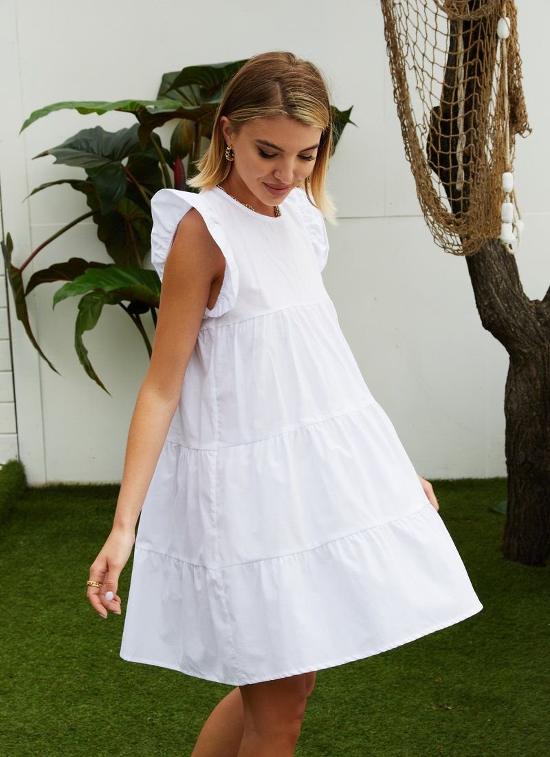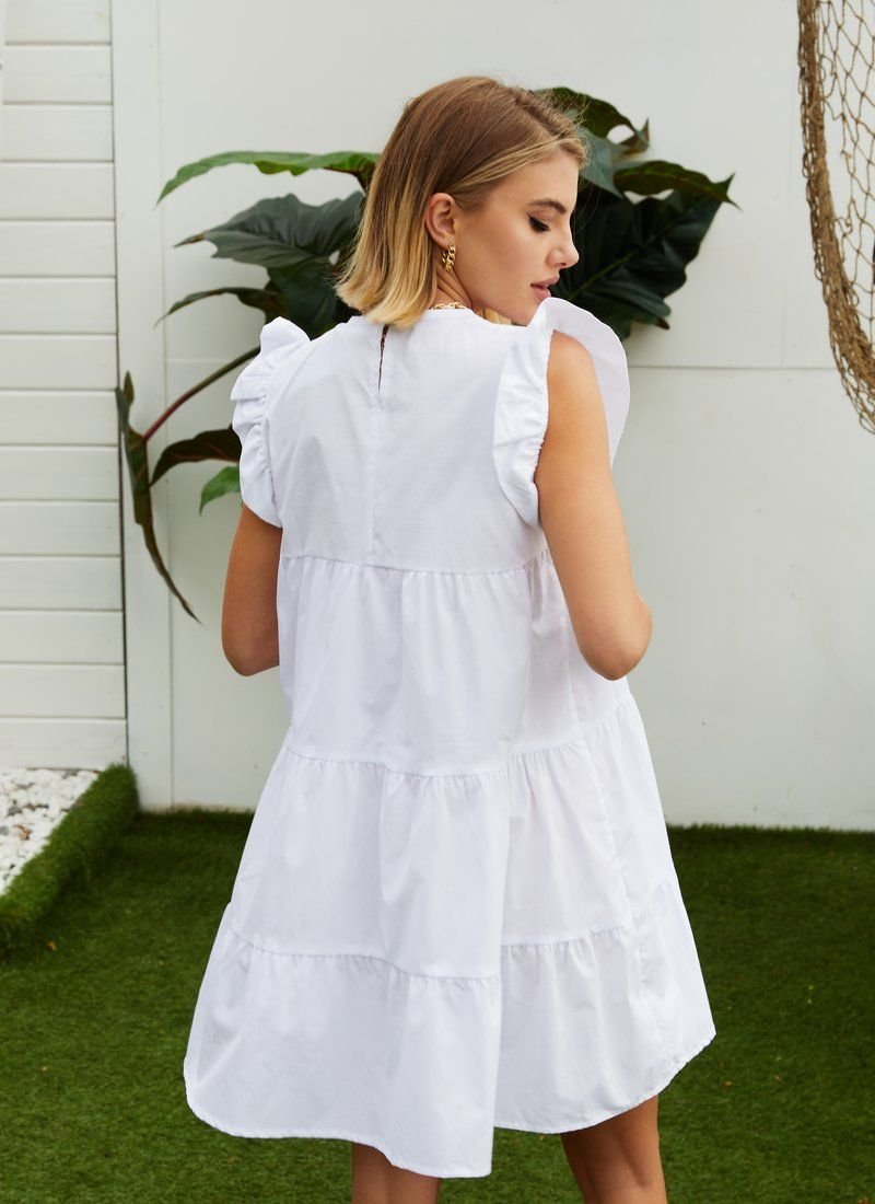 The white mini dress emphasizes comfort: a thin cotton-based material was used to sew the model with a flared multi-tiered hem. Wing sleeves support the airiness of the image.