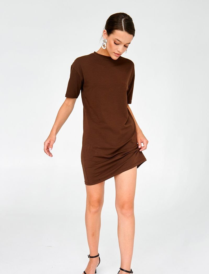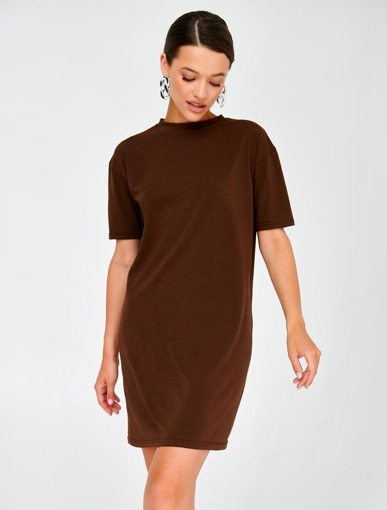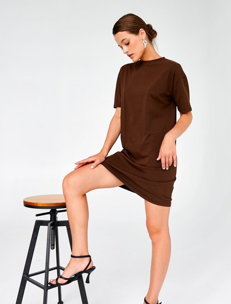 The basic dress is a cappuccino-colored T-shirt. Round neck, short sleeve, mini length. Such a thing will become the basis for your image, if you want to emphasize the waist, you can style it with a belt.