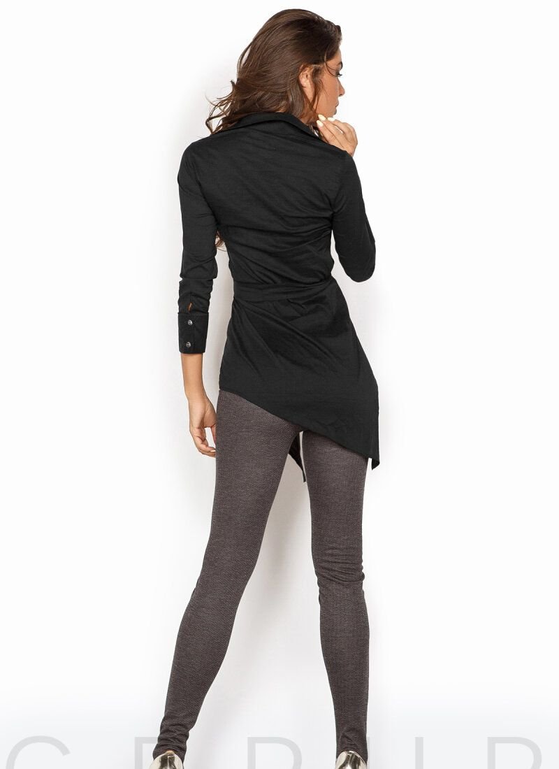 Cotton shirt of original cut with a classic stand-up collar, long sleeve with cuff, asymmetrical hem and removable belt to match.