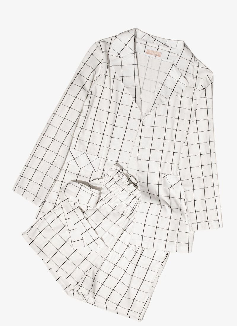 Elegant casual suit in white with a checkered print: a classic jacket without buttons with a turn-down collar and lapels, two decorative flap pockets in front. Shorts with an elastic insert at the waist and two pockets in the seams, complemented by a removable fabric belt to match.Please note that the model's print has changed (see additional photos).