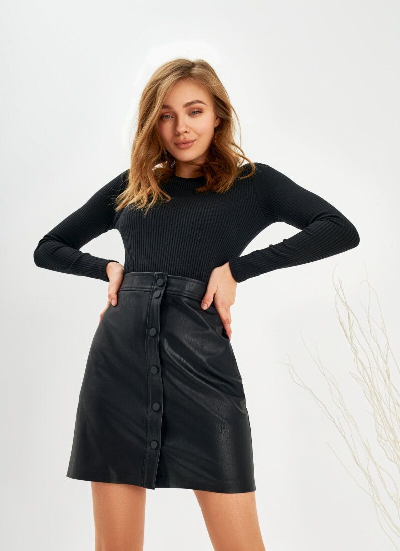The black longsleeve, cleaned of decor, will easily fit into the basic wardrobe, becoming a universal element in it. Elastic knitwear with a pleasant-to-touch ribbed texture was used to make a model with a round neck.