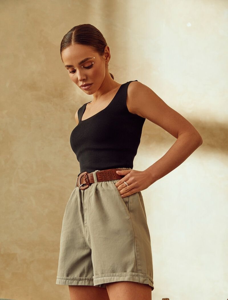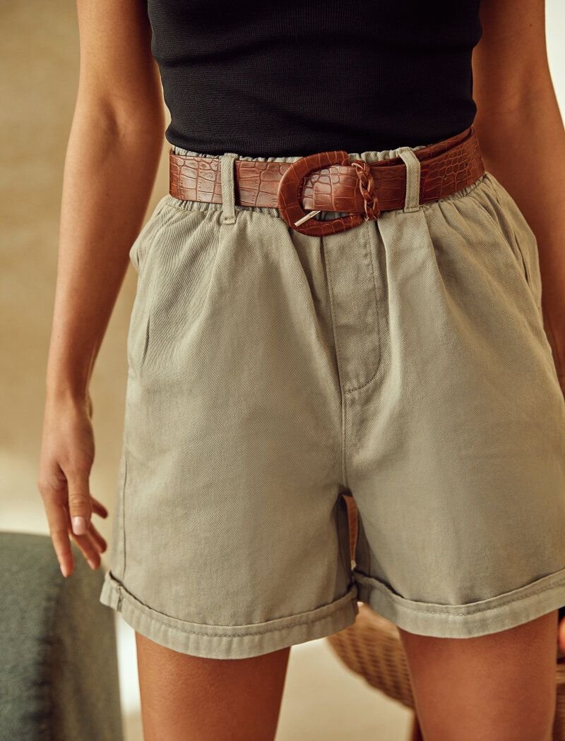 Gray shorts win in softness from denim options, due to the cotton material. Accents in the product were placed by the nuances of the cut: lapels, symmetrical pinches and a removable belt with a buckle and embossed crocodile skin. For additional comfort, the model has side pockets.
