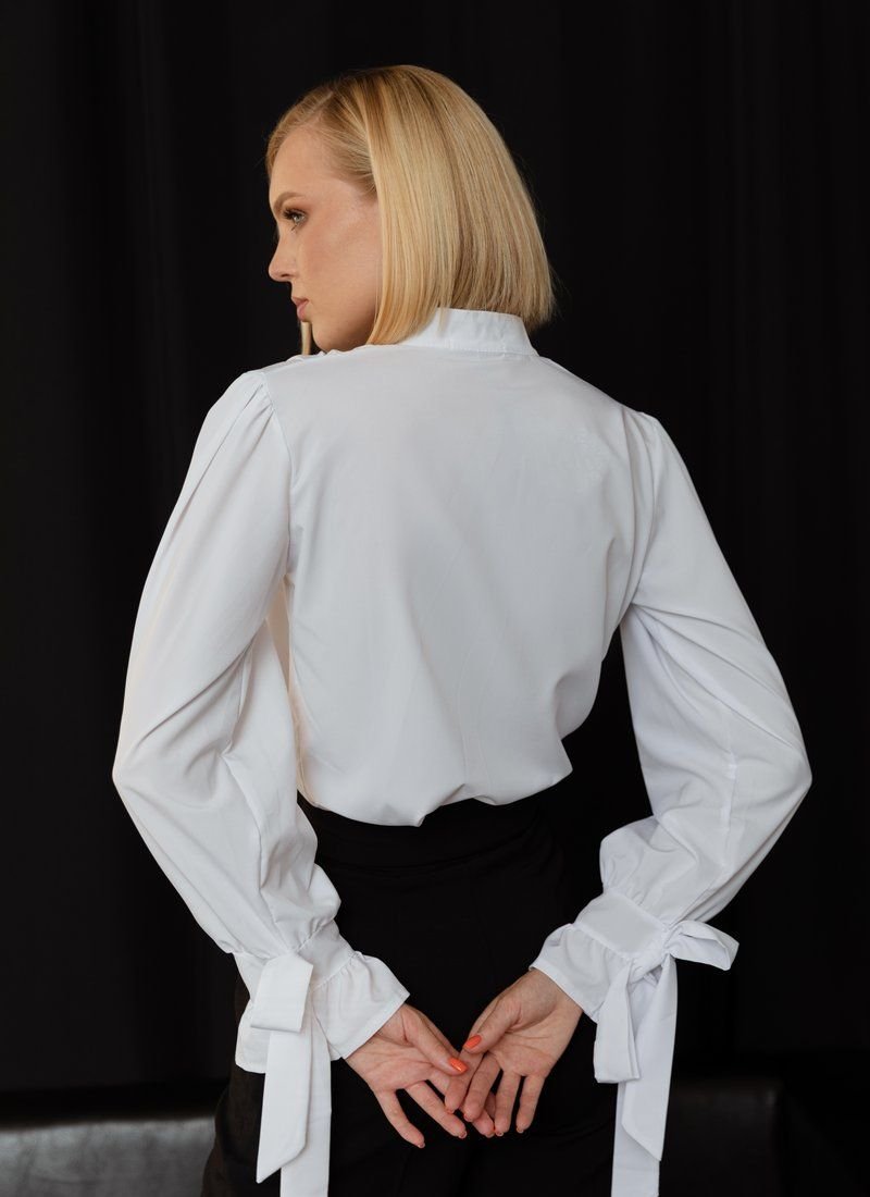 A white blouse with a stand-up collar, decorated with a black ribbon, which can be fixed on special rings, or left free. Long sleeve with decorative cuffs in the form of bows.