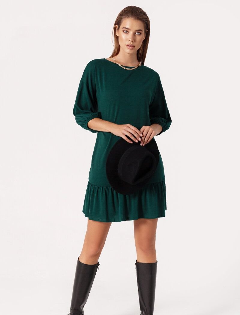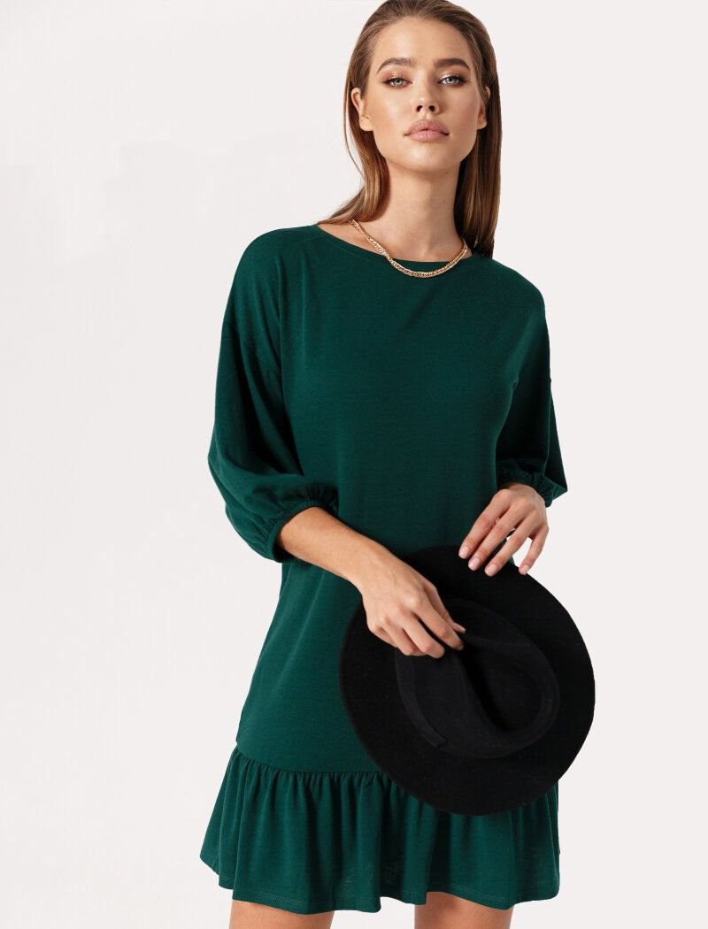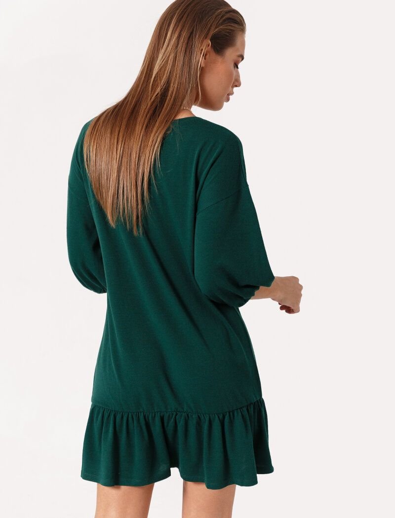 In creating an emerald mini dress, the main bet is made on comfort and conciseness of the style. The model with a round neck, 3/4 sleeves on elastic cuffs is sewn from a light knitted material. The airiness of the product was given with the help of a shuttlecock, effectively framing the hem.