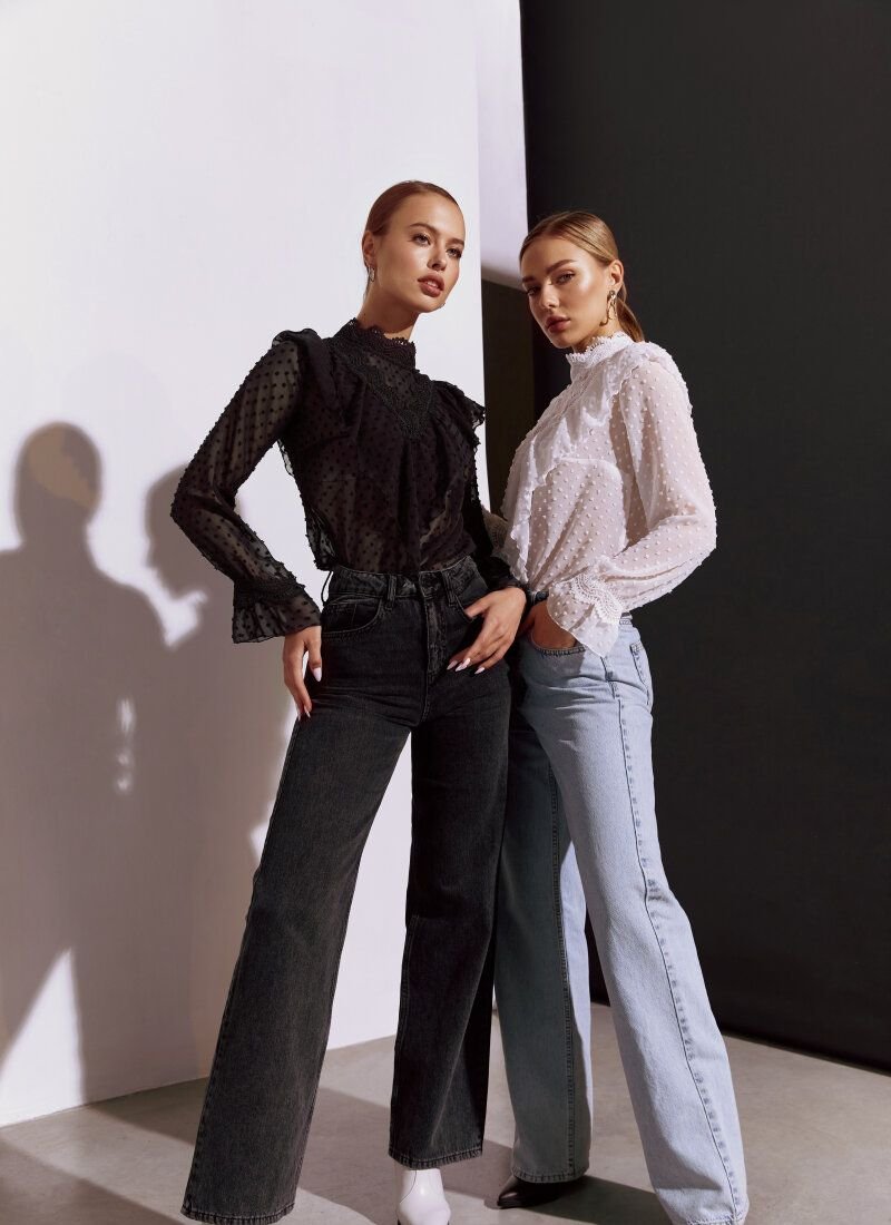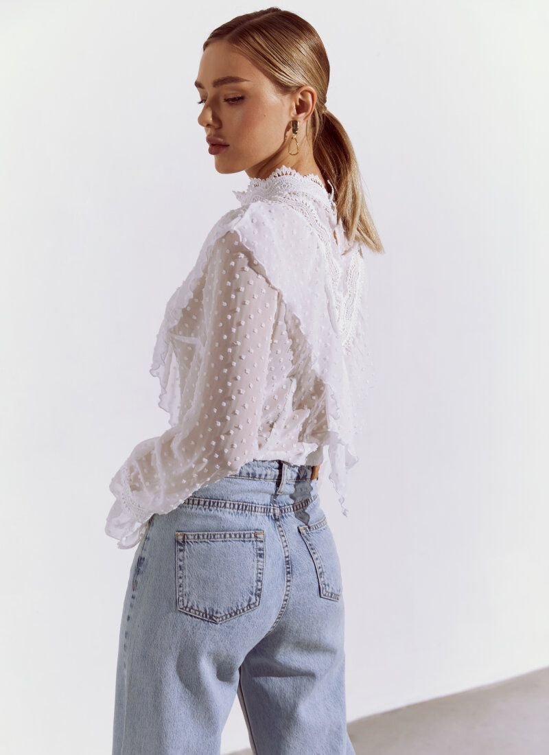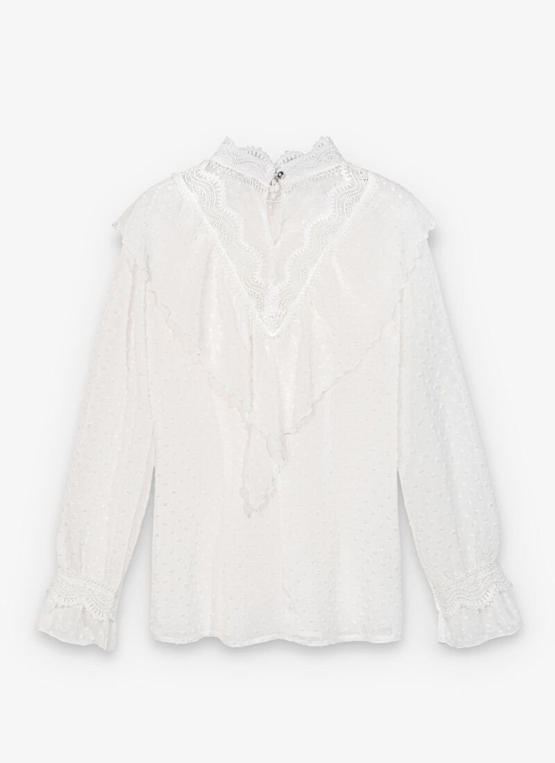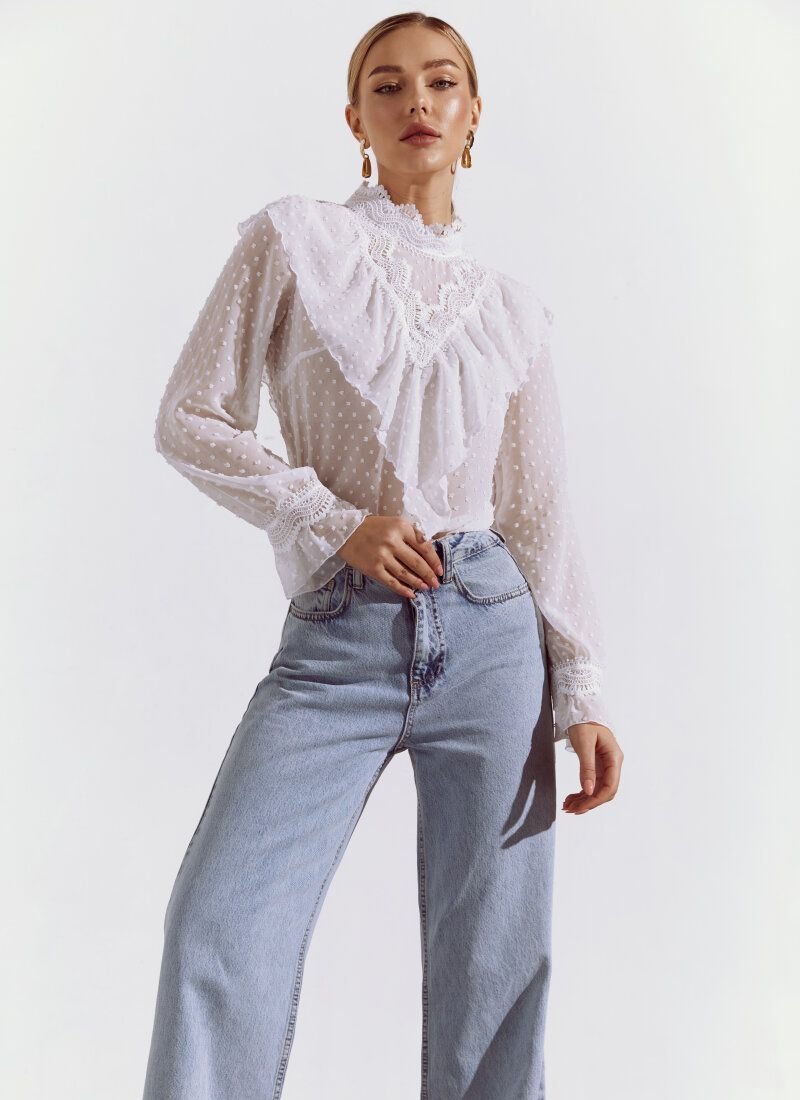 The white blouse was sewn according to all the canons of romantic style. The thin light fabric falls like silk, and the openwork stand-up collar is adjacent to a lush flounce and lace framing the triangular neckline area. Long wide sleeves are also complemented with decorative lace cuffs. The model is perfectly set off by strict trousers, shoes, a trench coat and a bag.