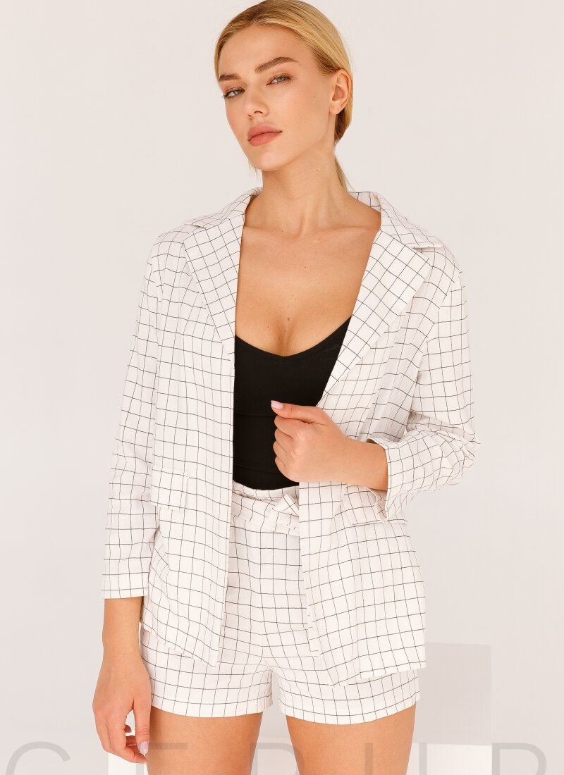 Elegant casual suit in white with a checkered print: a classic jacket without buttons with a turn-down collar and lapels, two decorative flap pockets in front. Shorts with an elastic insert at the waist and two pockets in the seams, complemented by a removable fabric belt to match.Please note that the model's print has changed (see additional photos).