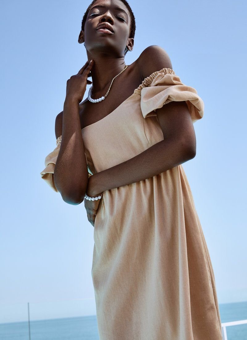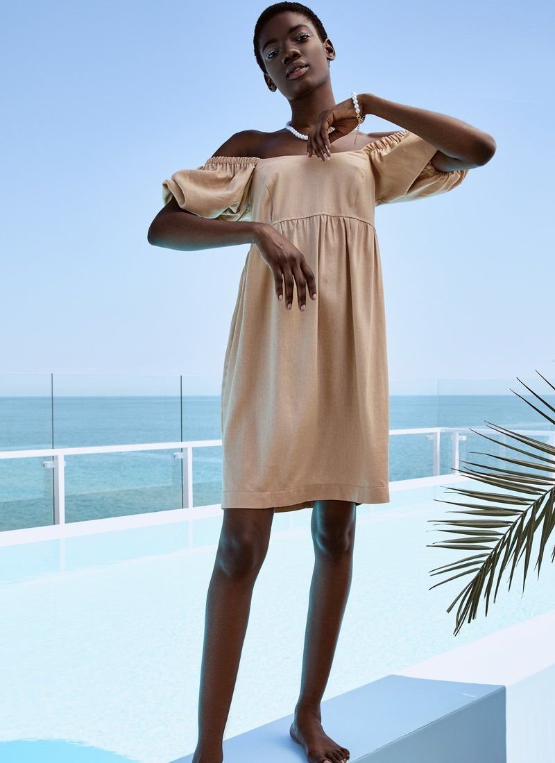 Beige dress successfully copes with multitasking, organically fitting both into the image for relaxing by the sea and into everyday look. For sewing a model with an open shoulder line and voluminous sleeves, a light material was chosen - eco-linen.