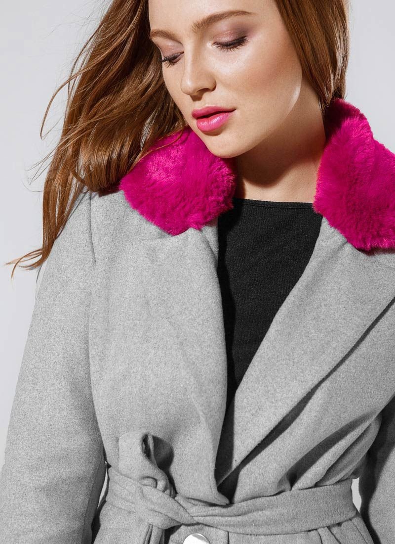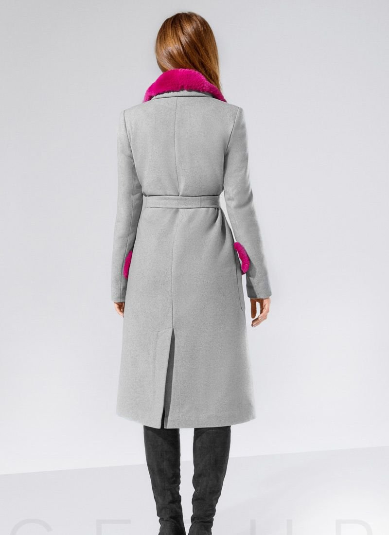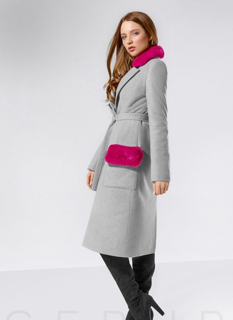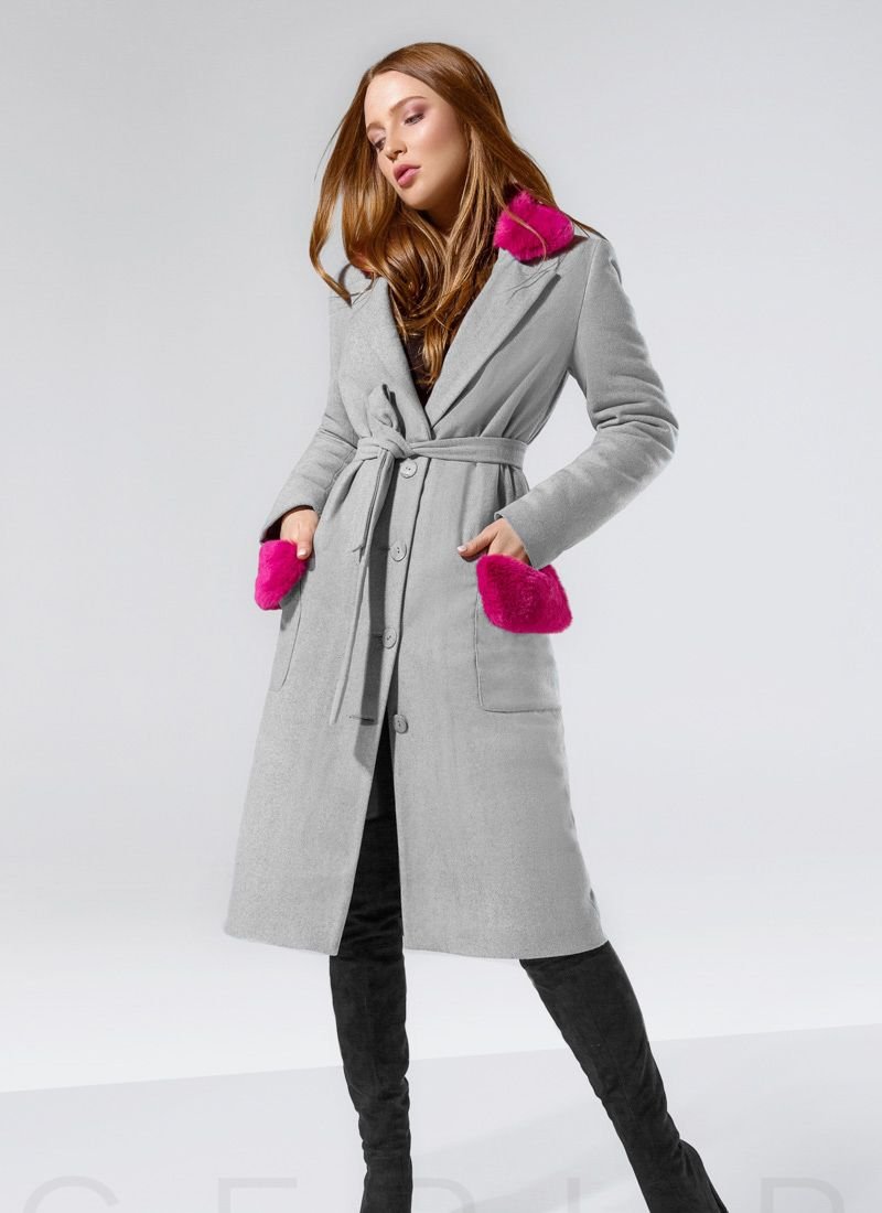 An elegant coat from Gepur designers, made of premium-class coat fabric: turn-down collar and pockets decorated with colored eco-fur, neat lapels and a removable belt to match.