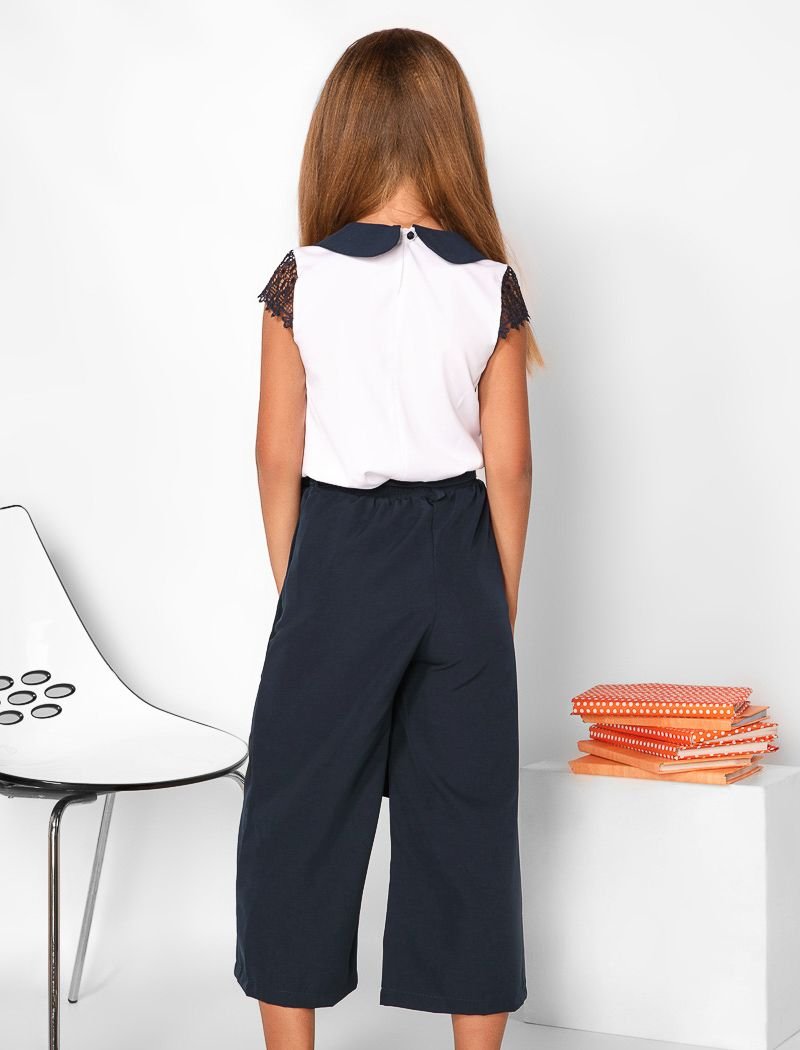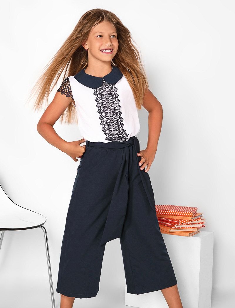 School culottes with a removable belt on the loops, made of suit fabric with a glossy sheen.