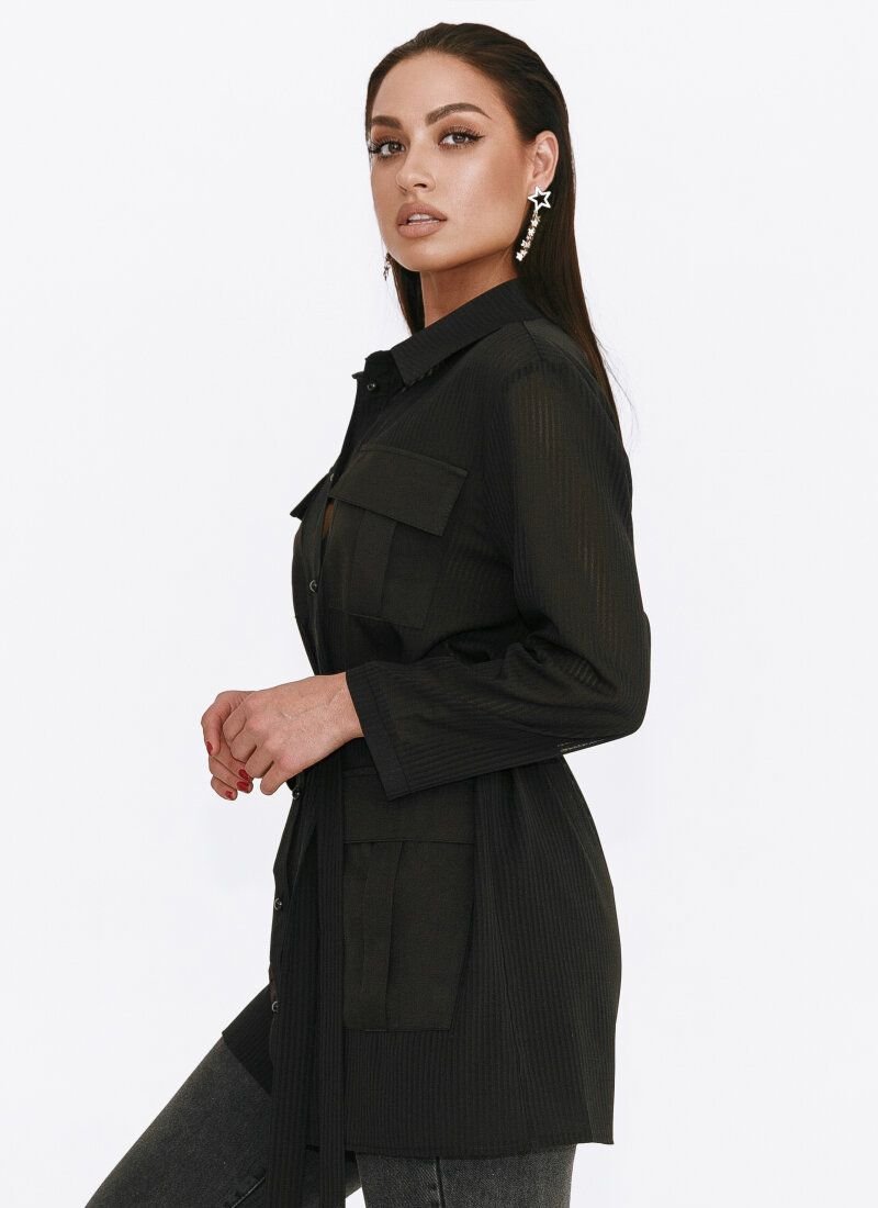 Stylish blouse with stand-up collar, 3/4 sleeves, patch front pockets with flaps, button placket in front. The model is complemented by a removable chiffon belt, which will make the silhouette fitted.