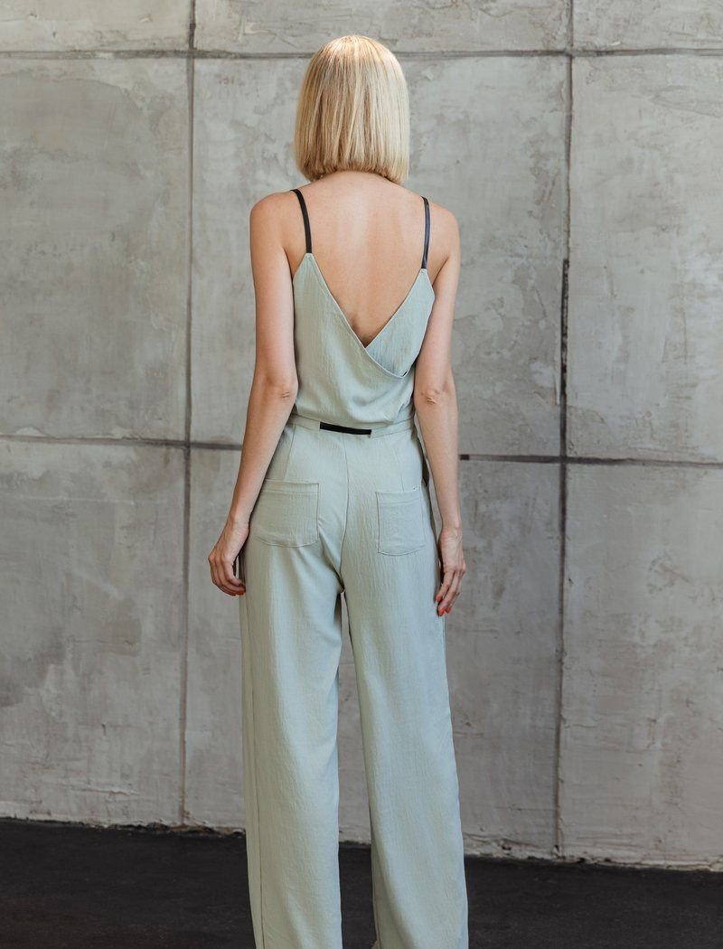 Mint jumpsuit with thin adjustable straps in black. It is also complemented by a belt that comes in the kit, there are pockets in the front and back. Wide trousers, in which your movements will be easy.