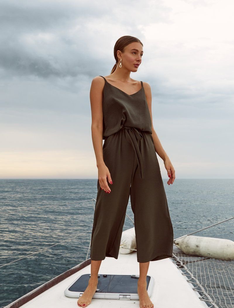 A loose-fitting pantsuit made of pressed fabric. Thin straps, a neat v-neck on the chest, an elastic insert on the waist and two small pockets on the sides. The set includes a removable belt-ribbon to match.