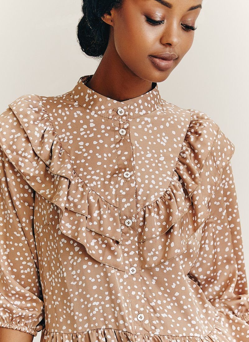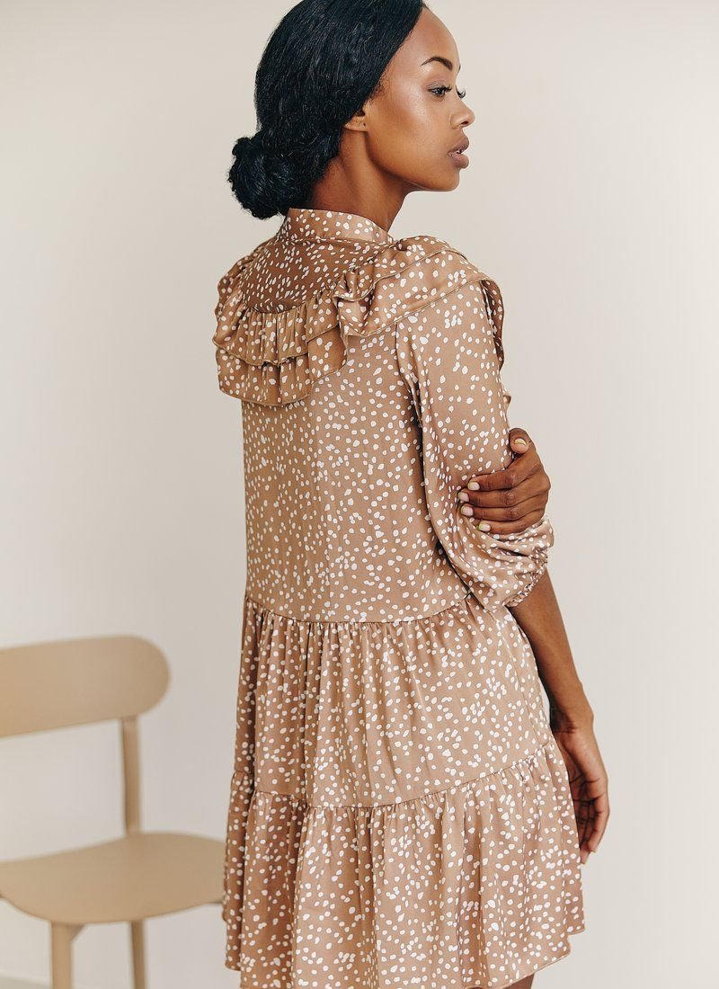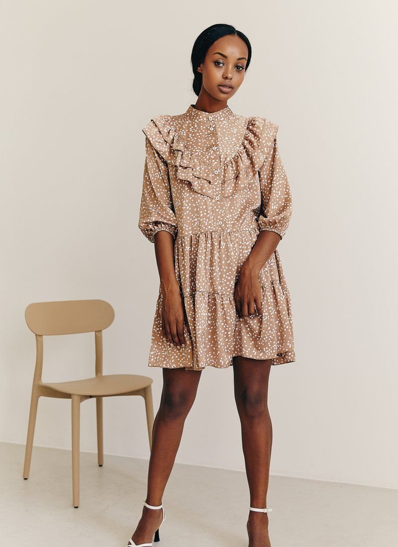 A very light and delicate beige dress with polka dots of a loose cut, with a stand-up collar with buttons in front, with neat ruffles on the chest and a frill on the skirt. Cropped sleeve with elastic insert. Made of a nice soft fabric that will make your look airy.