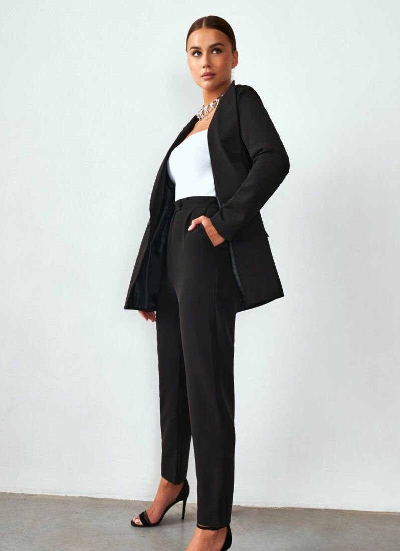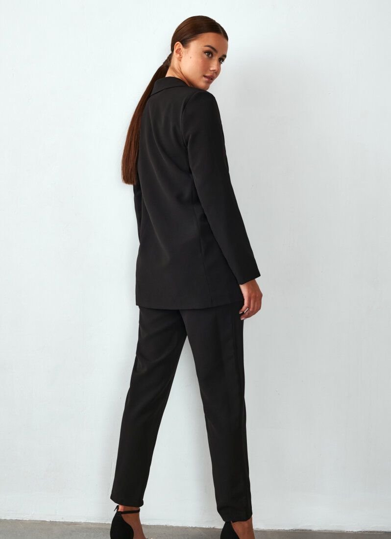The suit will easily become the basis of a stylish image in a classic style. Jacket with long sleeves, turn-down collar with lapels, welt front pockets with flaps. The shoulder line is emphasized by foam inserts. Double-breasted button closure in contrasting color. Straight trousers with a high fit complement the look.
