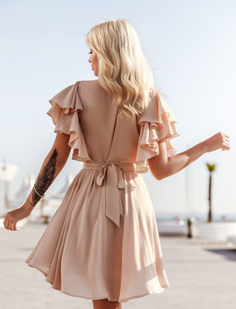 A short fitted dress on the back?x, made of soft chiffon fabric, from Gepur designers: a deep v-neck, a short sleeve with a flounce, a flared two-layer skirt in a light fold.