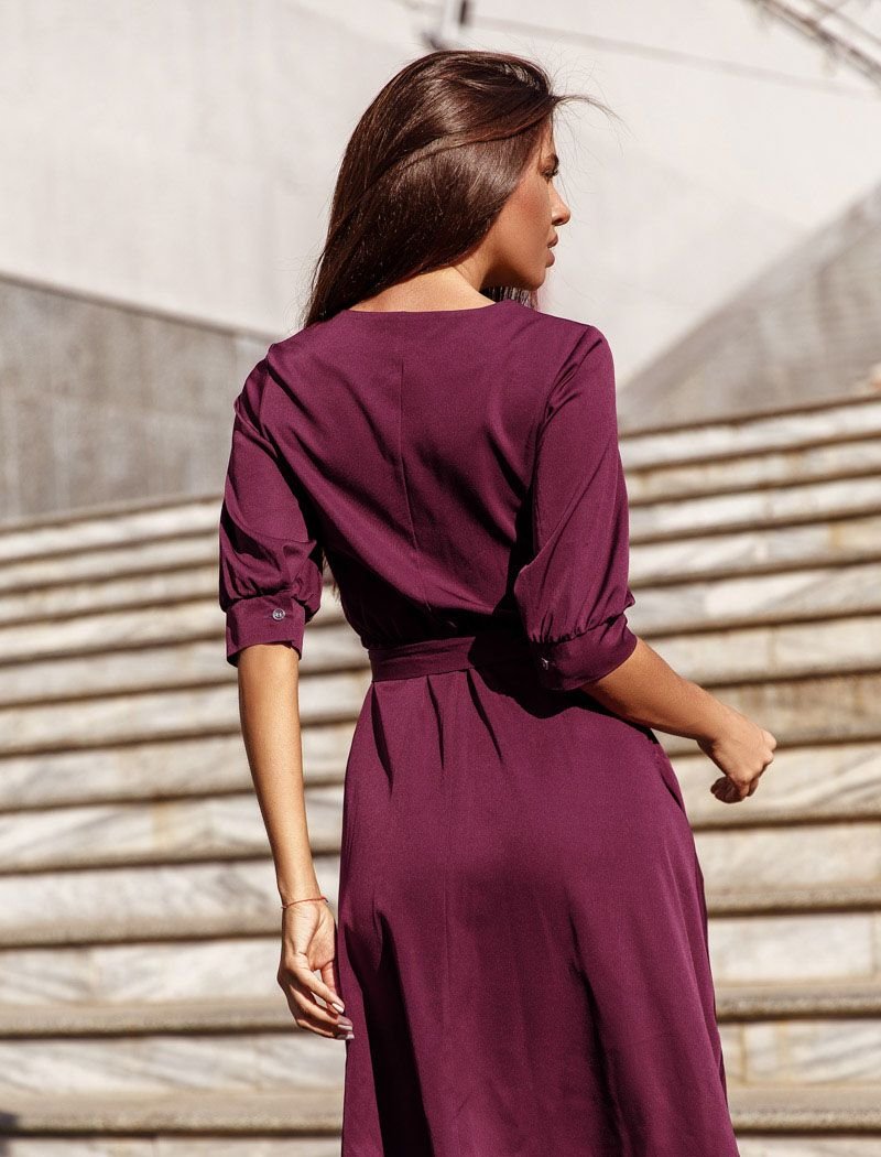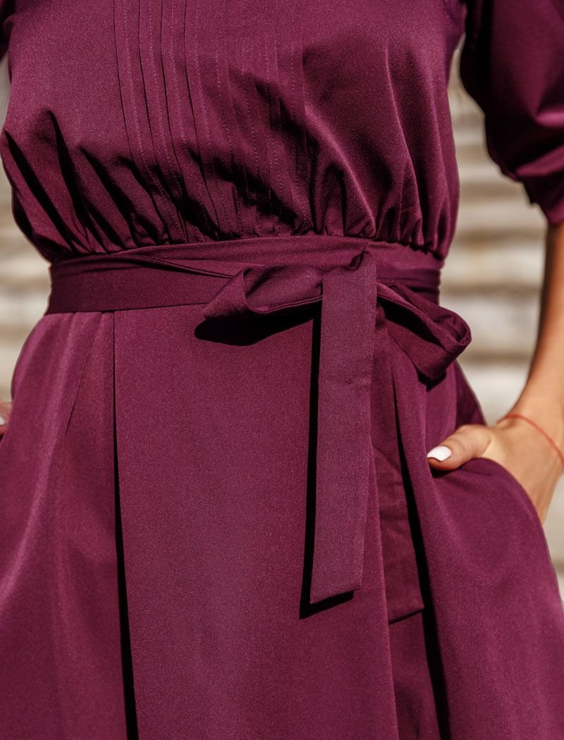 A classic cut dress with a round neck, 3/4 sleeve on a wide cuff with a button, a yoke decorated with light drapery, a cut-off waist and a flared skirt with pockets in the seams. complemented by a removable belt.