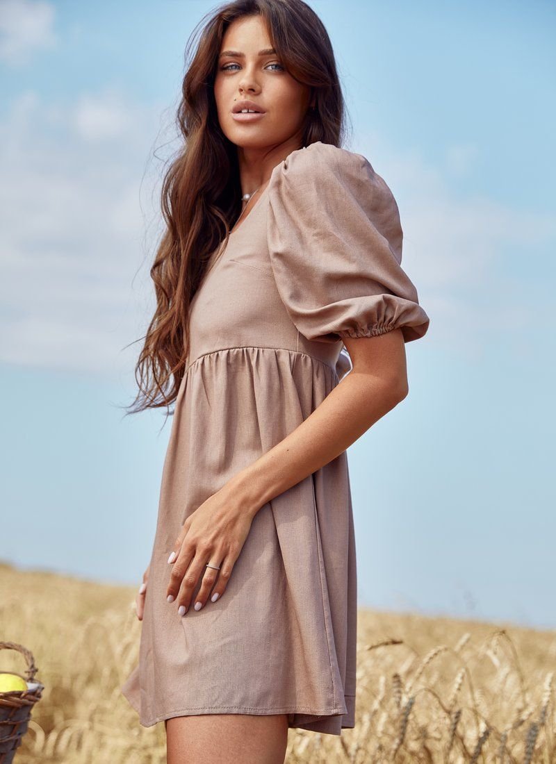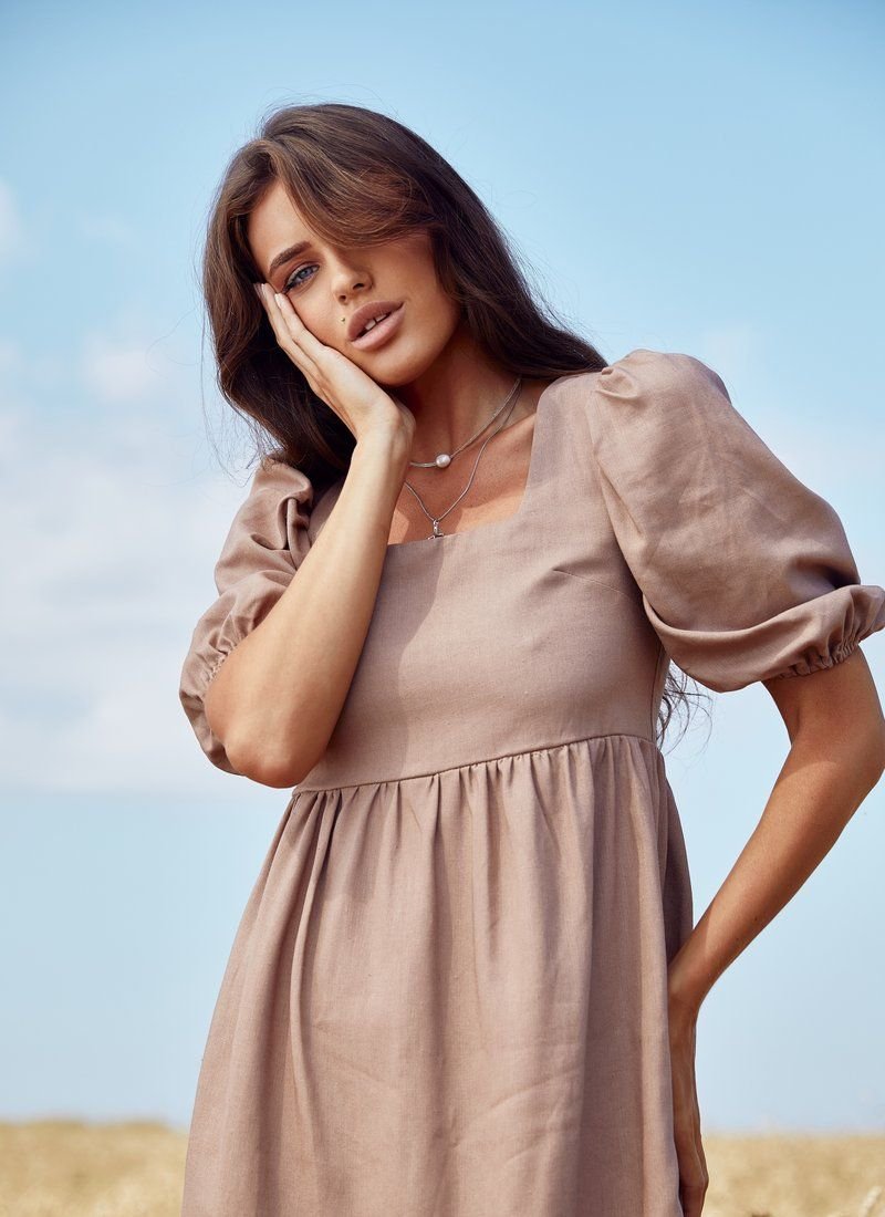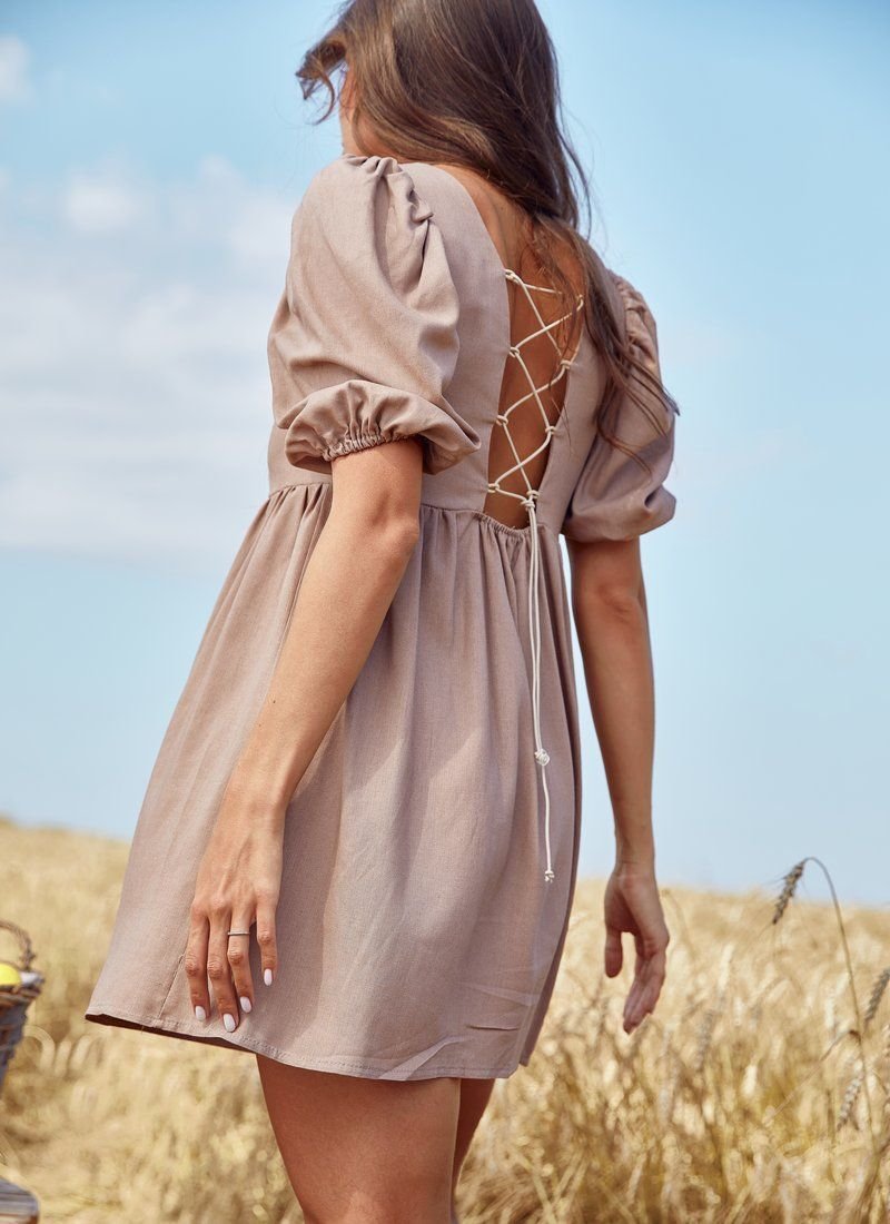 A short dress with an inflated waistline, made of soft linen fabric. The open back is complemented by elastic lacing. A spectacular puffy sleeve with an elastic cuff and a neat square neckline on the chest. the dress is perfect for everyday looks in the hot season.