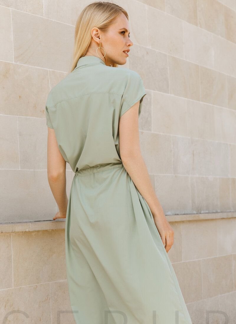Comfortable green shirt dress made of light fabric. Turn-down collar, front strap with buttons. There are two patch pockets with flaps on the chest. At the waist there is a sewn-in belt with ties to accentuate the waist, a skirt in a light fold.