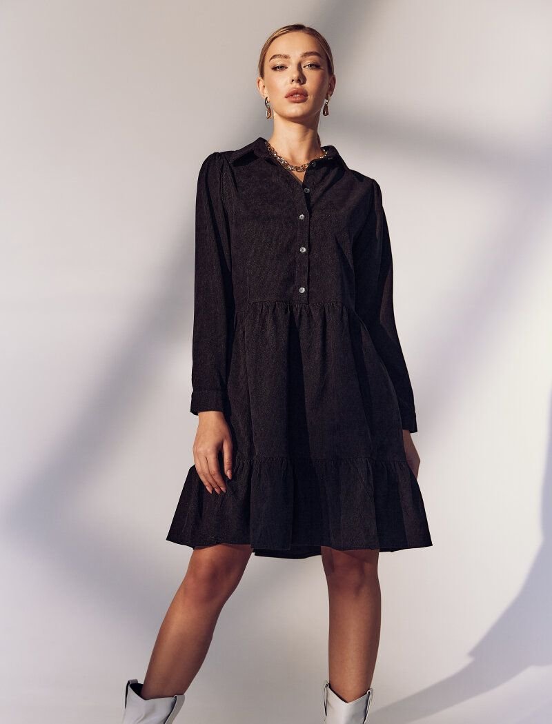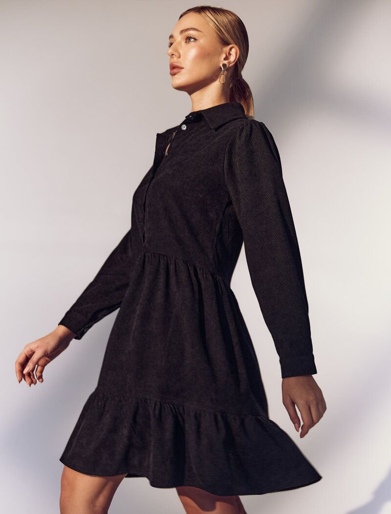 A short black dress will harmoniously complement your everyday wardrobe. For sewing a model with a bodice, like a shirt, corduroy was used, which has a pleasant velvet texture. The flared skirt was supplemented with a flounce.