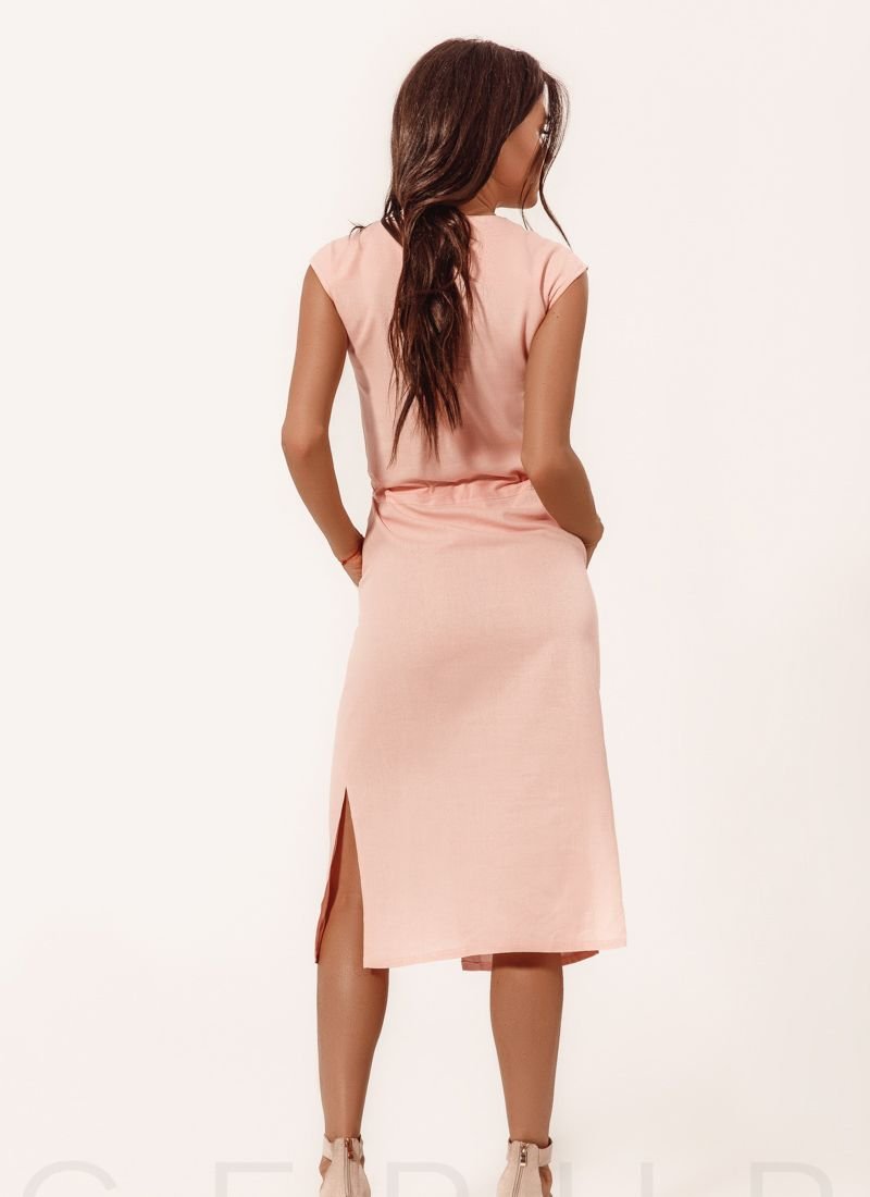 Casual dress of classic cut without sleeves, round neck, ties at the waist, rounded hem with slits on the sides and two pockets, patch with a flap on the chest and cut-off on the skirt.