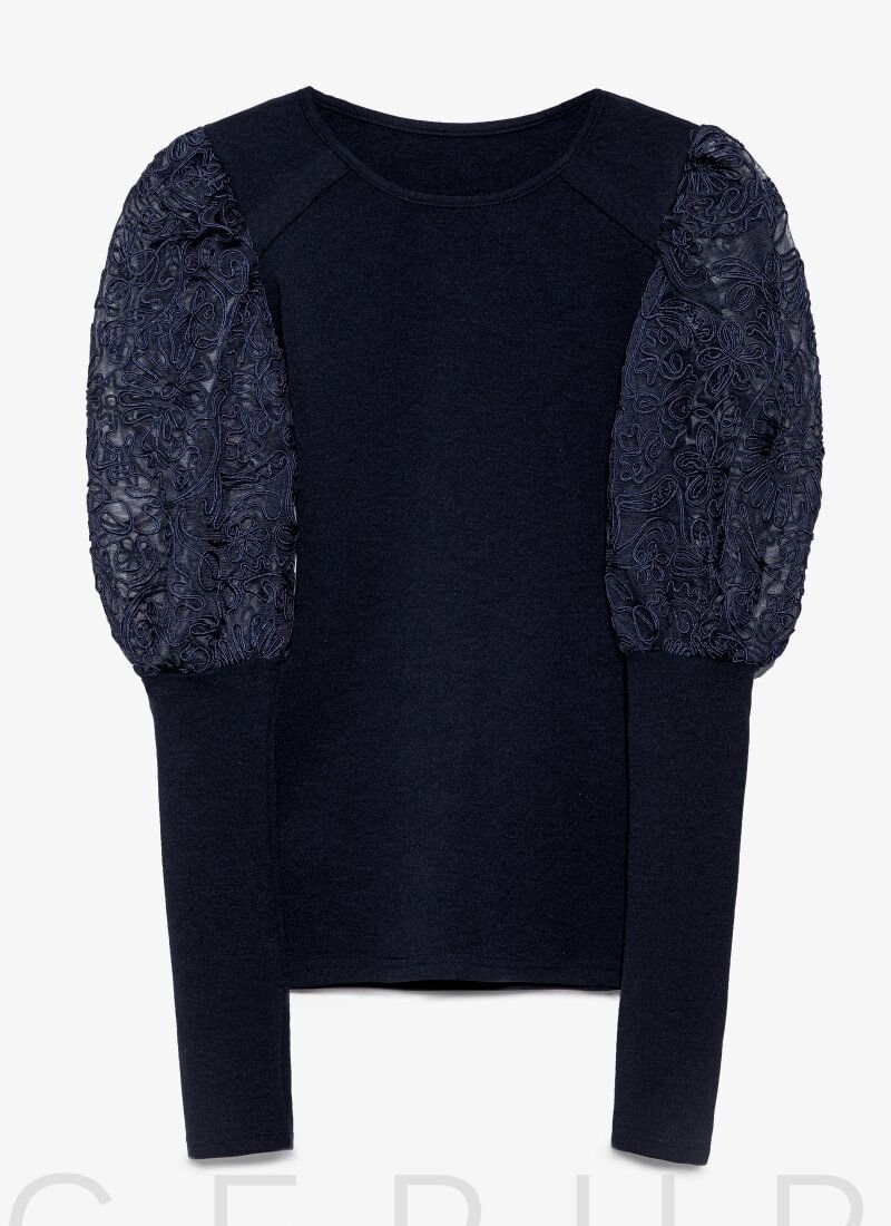 Knitted jumper in blue. Elongated cut. Round neck, long sleeve with transparent volume insert. and decorative buttons on the shoulders.