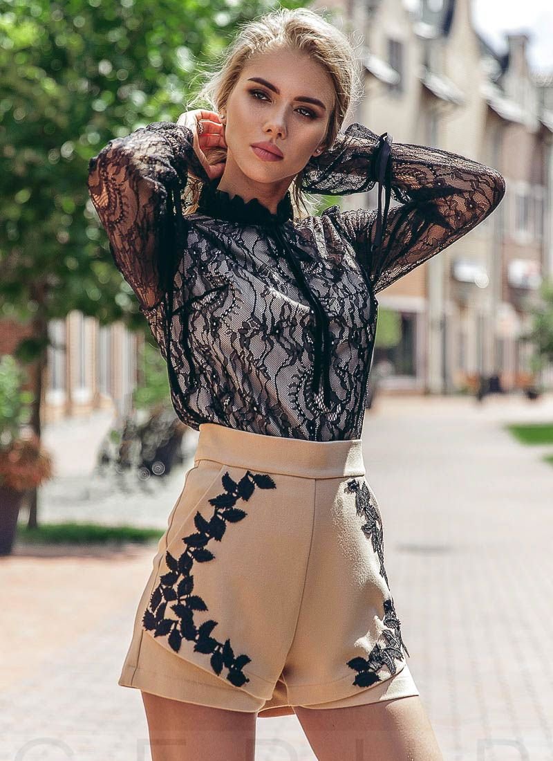Exquisite women's blouse made of elastic lace with a silk base: stand-up collar with ruffles and sewn velvet ties