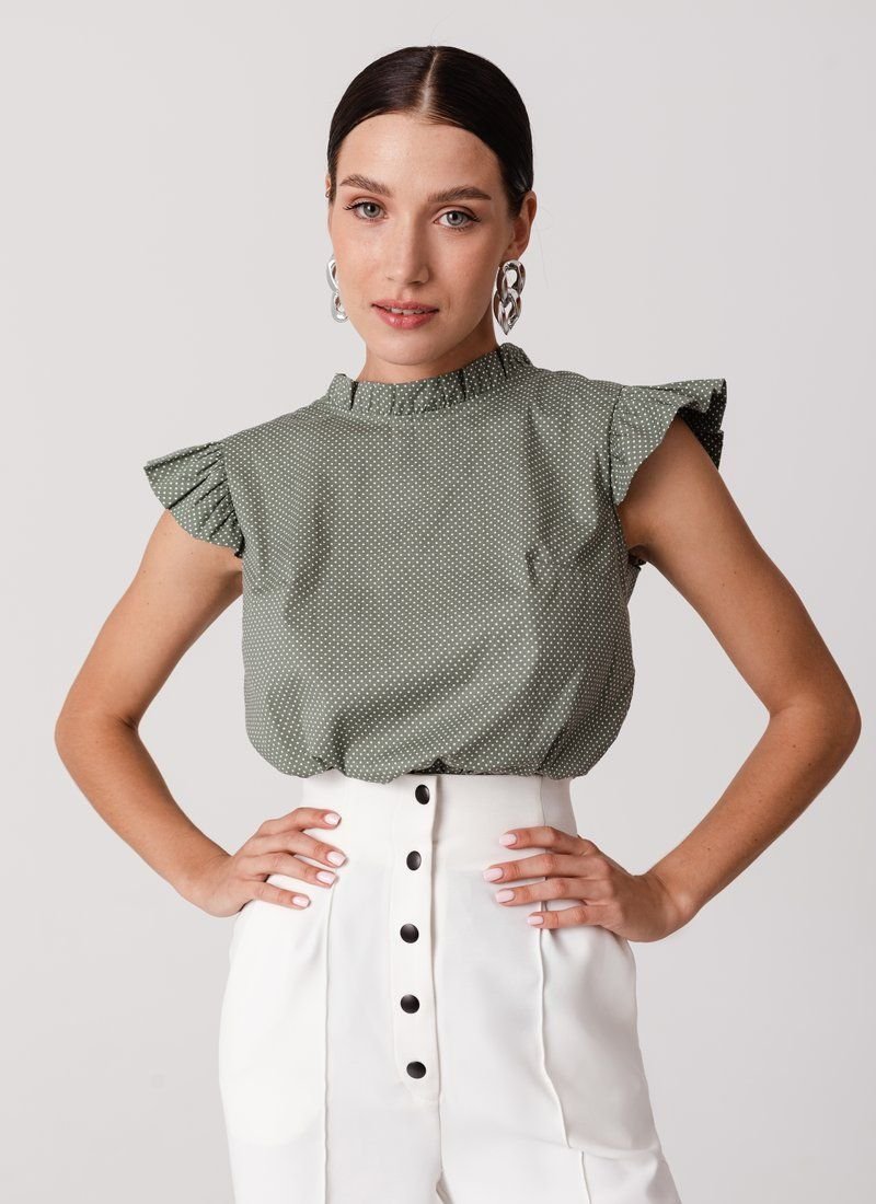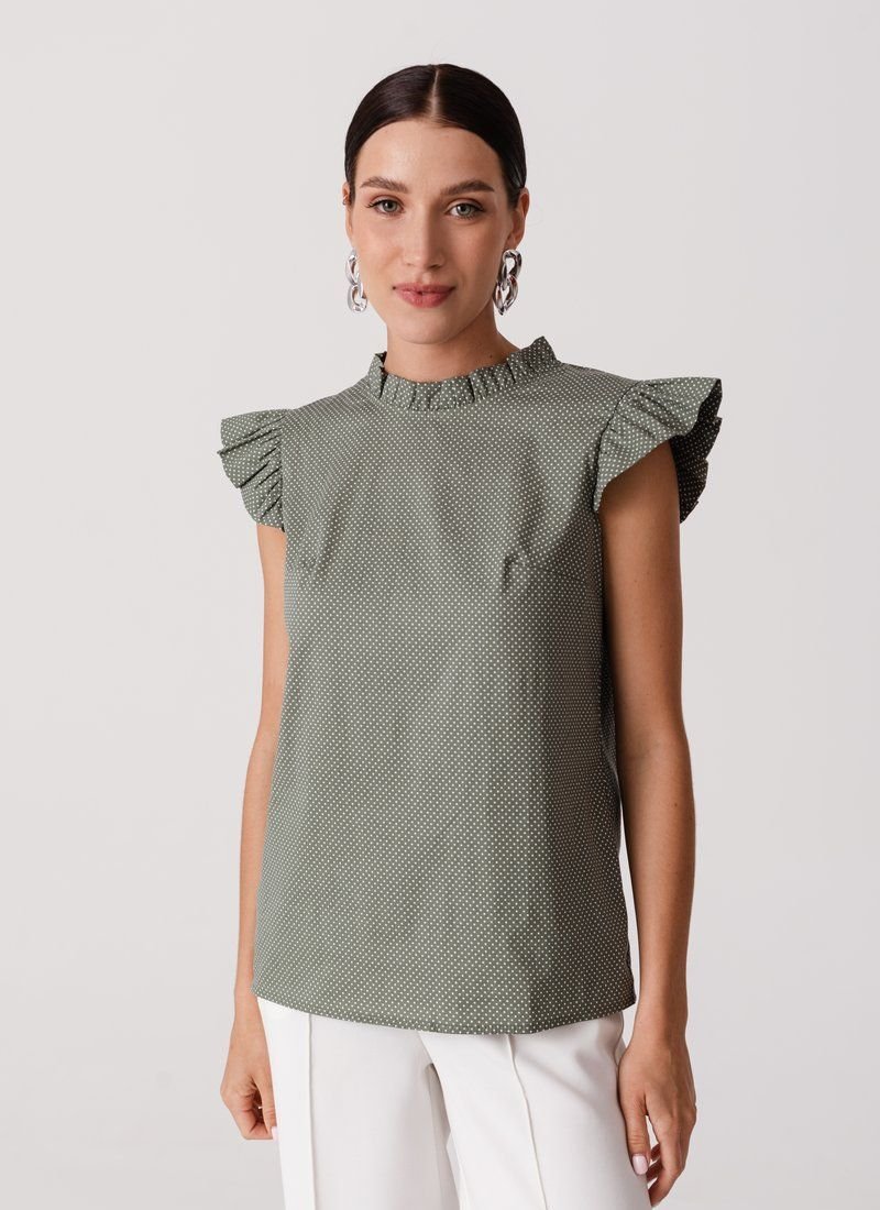 A loose silhouette, wing sleeves, a ruffled collar, wide ruffles and a print in small peas made the blouse as romantic as possible. Soft cotton material does not overheat the skin and allows you to feel comfortable.