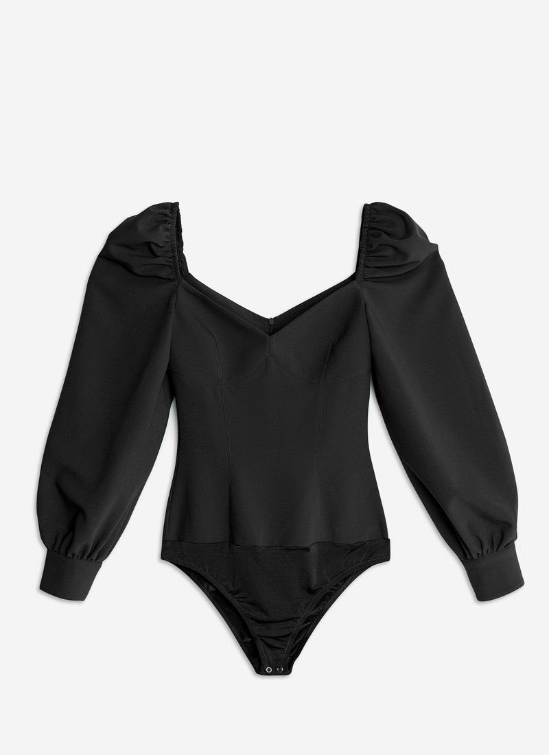A black bodysuit made of costume fabric supports several SS?21 trends at once: voluminous sleeves and a curly neckline. The model is perfect for a special occasion - a date, a party or going out. The product is complemented by a zipper at the back.