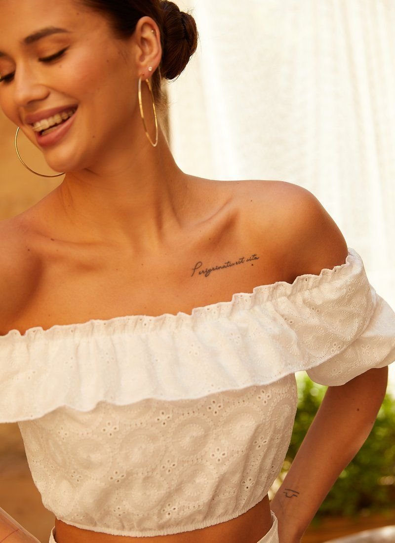Original white suit made of cotton fabric. crop top with elastic inserts, open shoulders, flounce and short sleeves. Short shorts with a high fit are complemented by a removable belt-a ribbon to match.