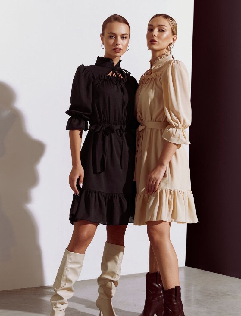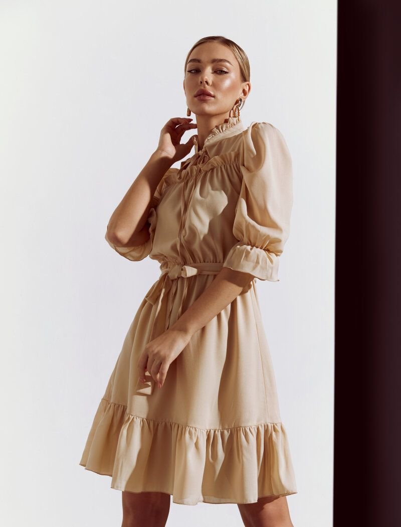 Assemblies, ruffles and flounces could be seen on the Victoria Beckham and Bottega Veneta models in the FW'20/21 season. The product was sewn from translucent weightless chiffon with a matching lining. The short dress was decorated with a wide frill at the hem, assemblies: on the stand-up collar with ties and the chest line.